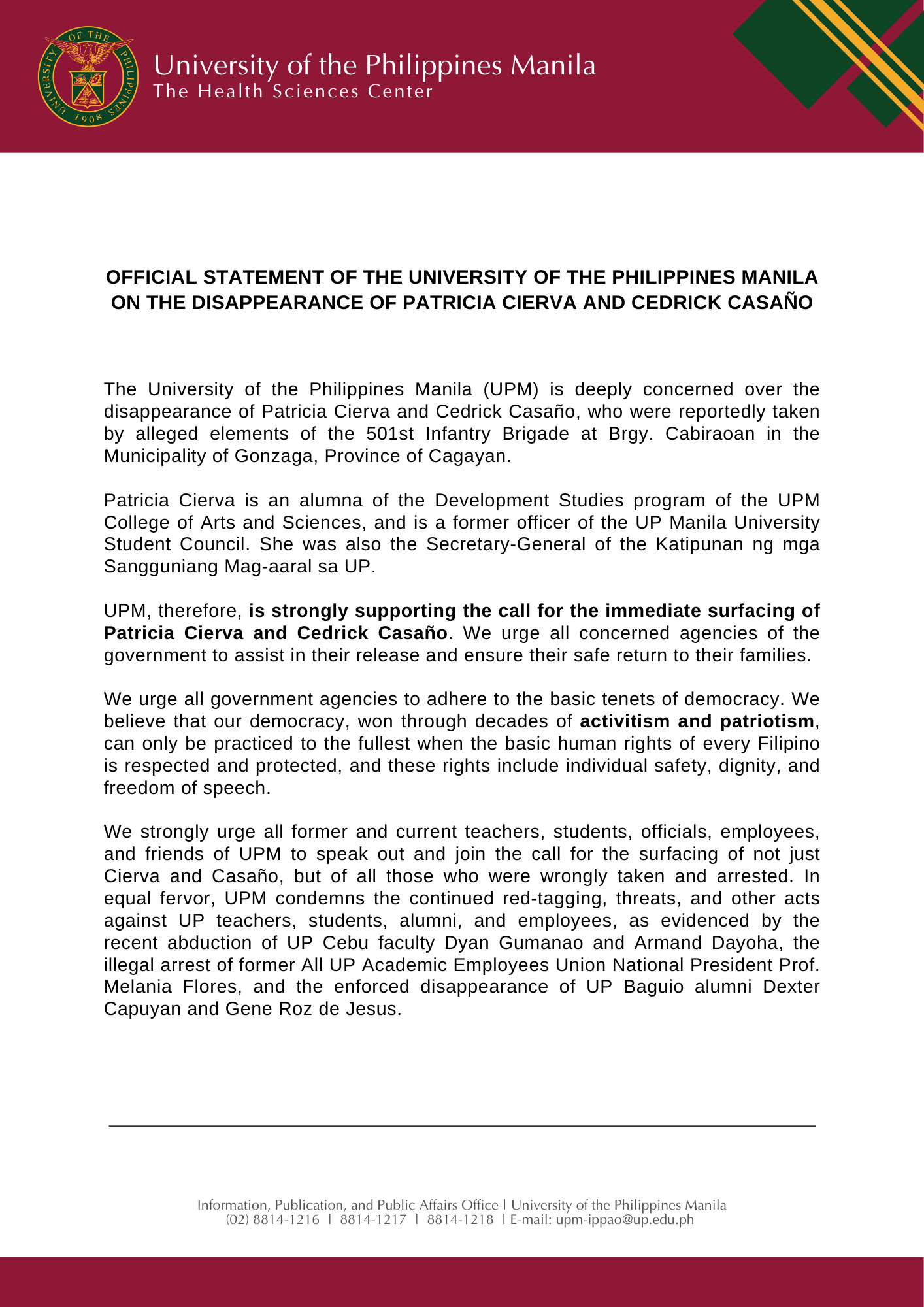 Official Statement of the University of the Philippines Manila on the Disappearance of Patricia Cierva and Cedrick Casaño