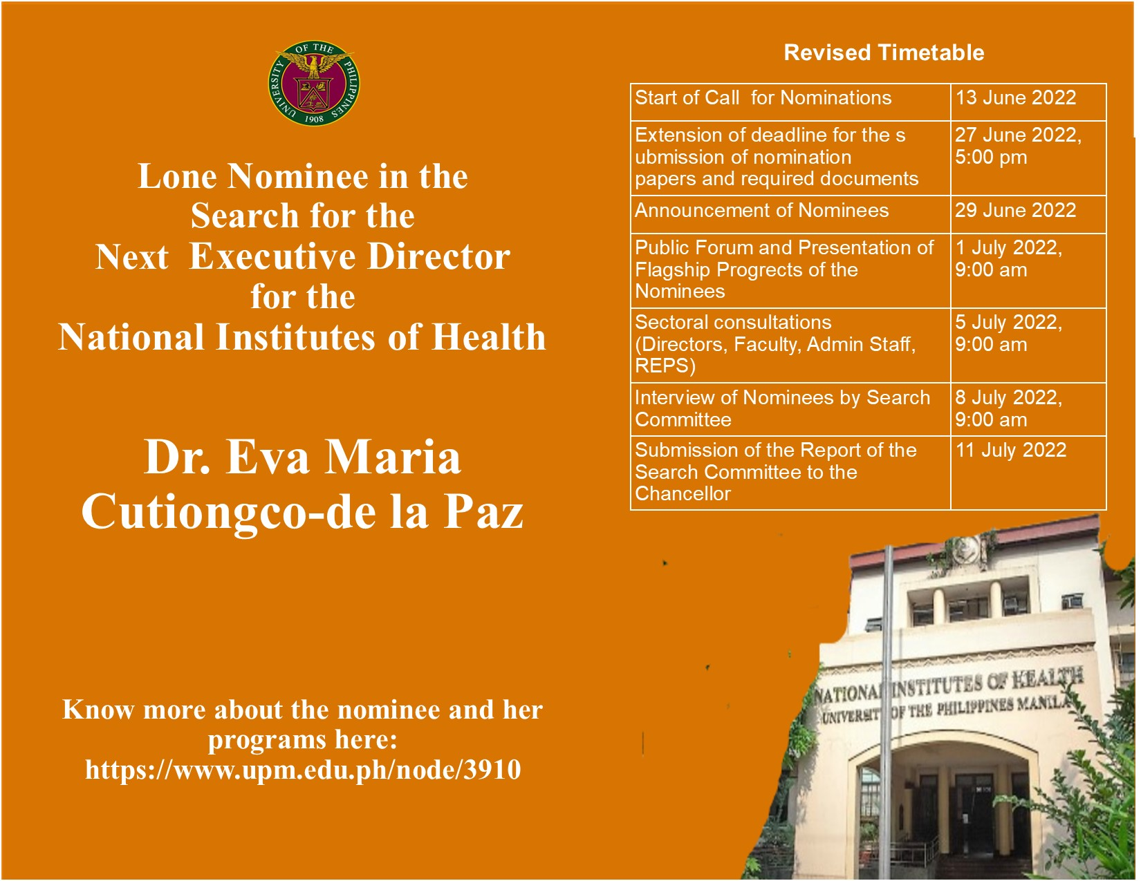 Lone Nominee in the Search for the Next Executive Director for the National Institutes of Health: DR. EVA MARIA CUTIONGCO-DE LA PAZ