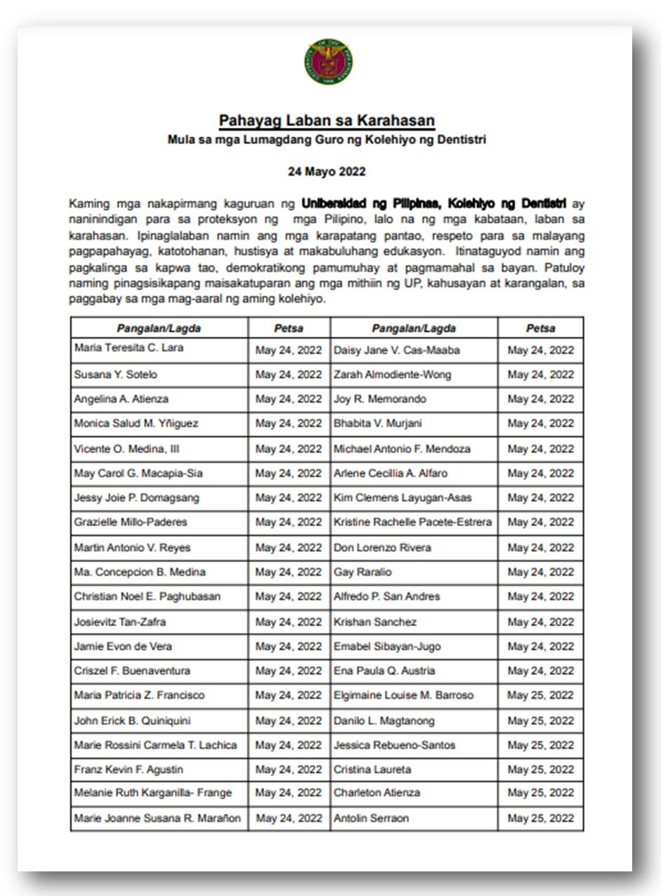 PAHAYAG LABAN SA KARAHASAN: Mula sa mga Lumagdang Guro ng Kolehiyo ng Dentistri (24 Mayo 2022)