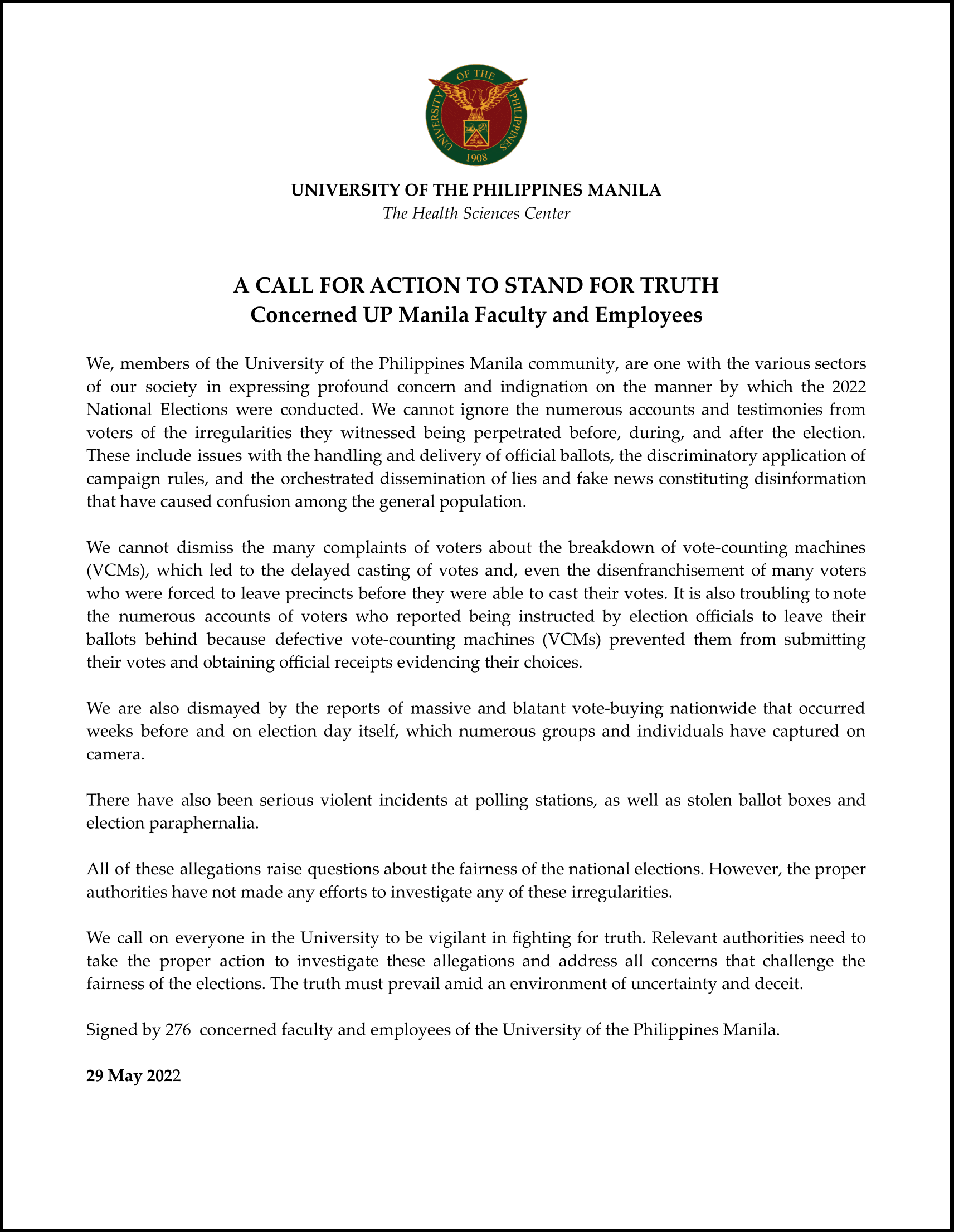 A Call for Action to Stand for Truth (Statement of UP Manila Faculty & Staff on the 2022 National Elections)