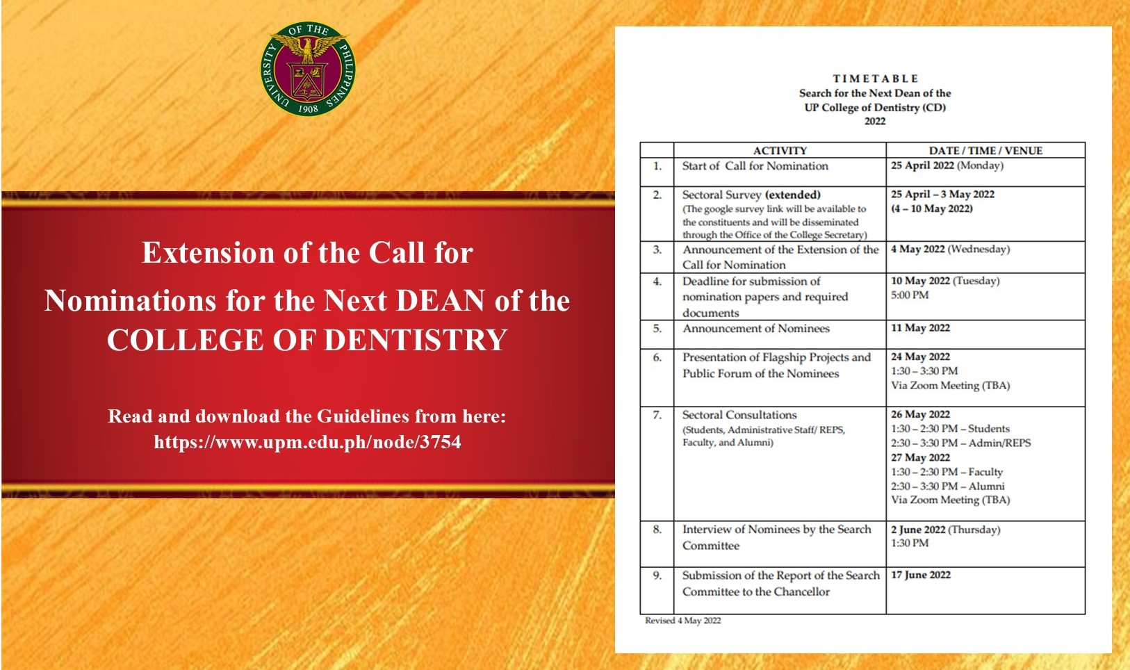 Extension of the Call for Nominations for the Next DEAN of the COLLEGE OF DENTISTRY
