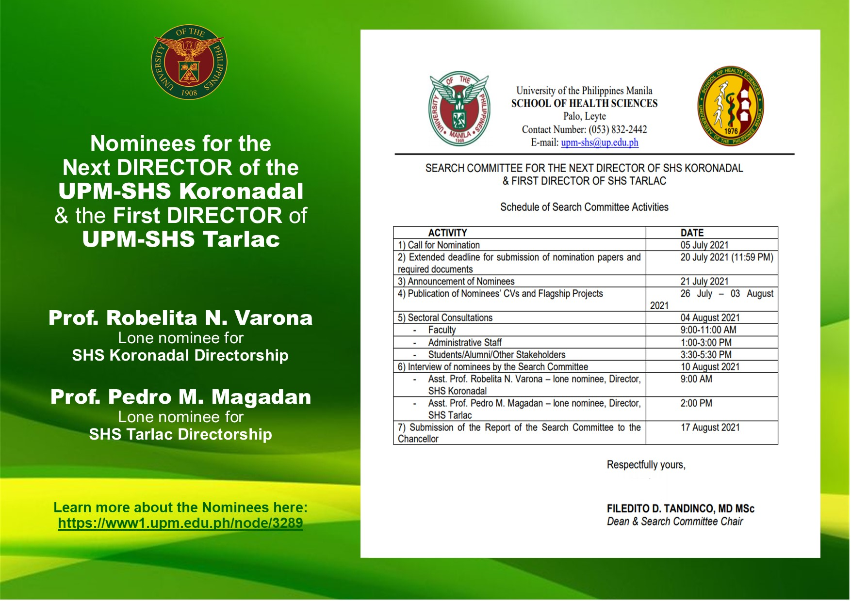 Nominees for the Next DIRECTOR of the UPM-SHS Koronadal & the First DIRECTOR of UPM-SHS Tarlac