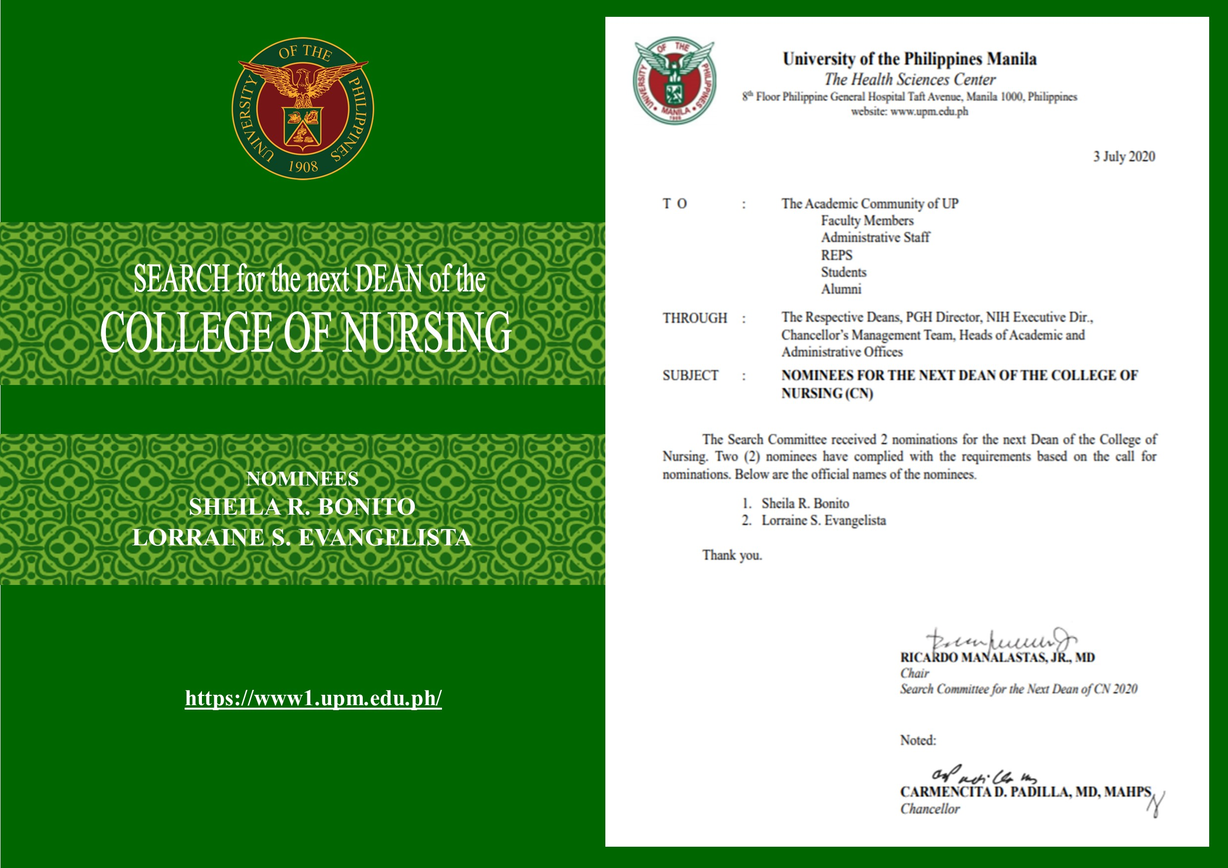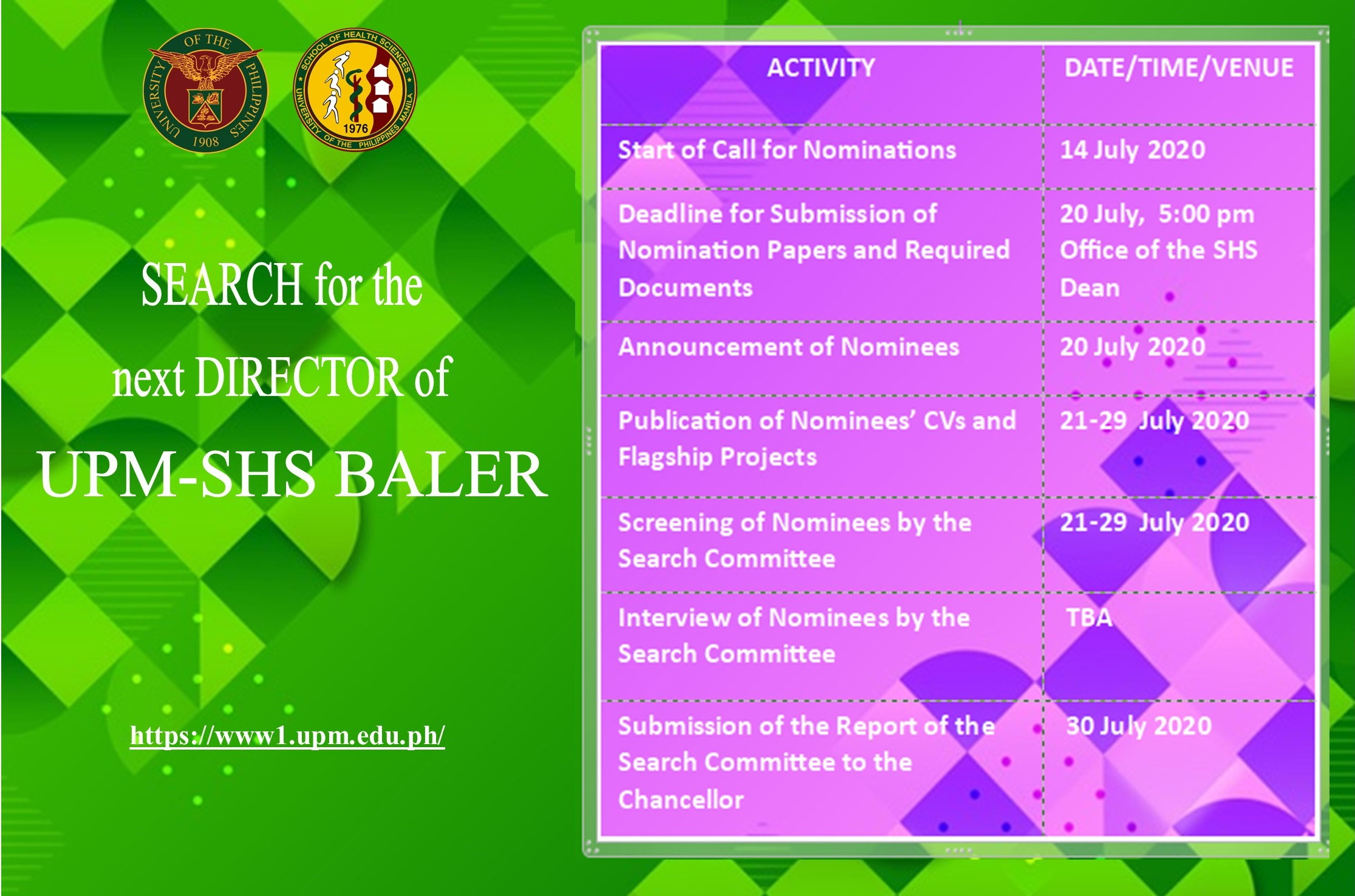 Call for Nominations: Search for the next Director of the UPM-School of Health Sciences (Baler)