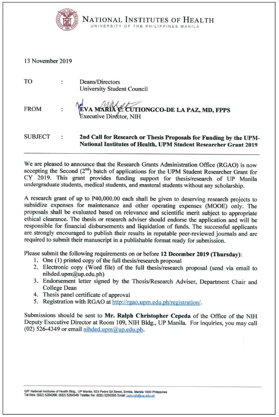 2nd Call for NIH Student Researcher Grant 2019