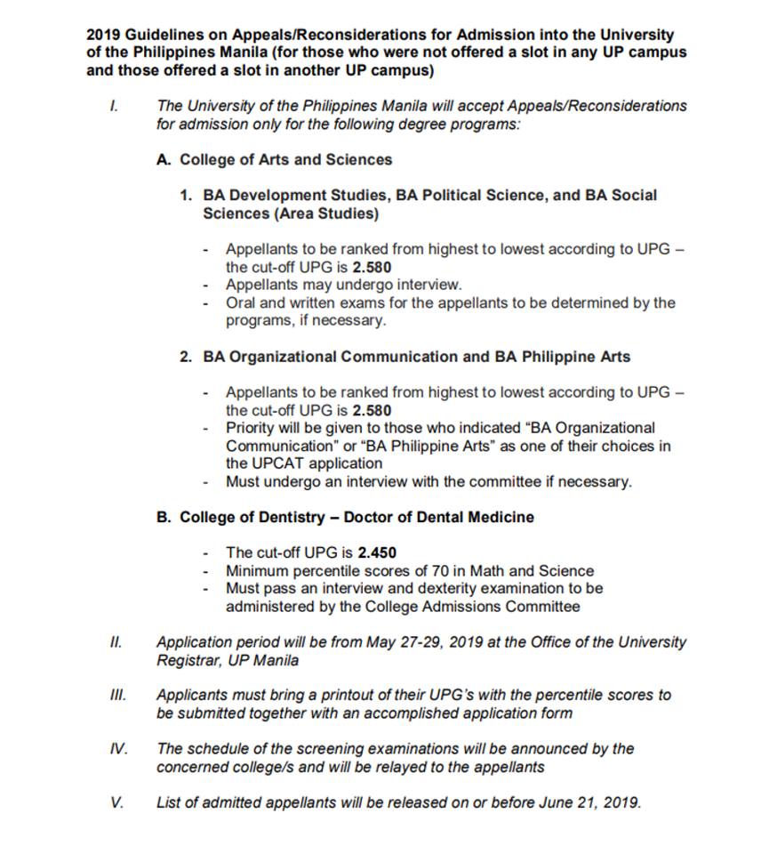Announcement: “2019 Guidelines on Appeals/Reconsideration for Admission into the University of the Philippines Manila”