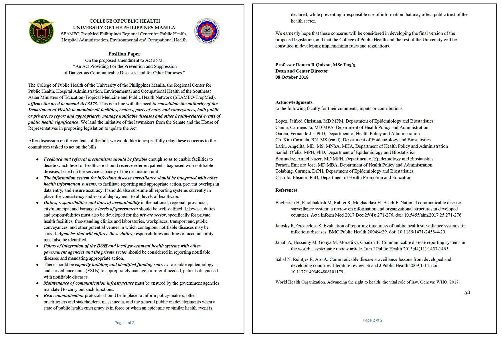UPM-CPH Position Paper on Amending Act 3573 (“An Act Providing for the Prevention and Suppression of Dangerous Communicable Diseases, and for Other Purposes”)