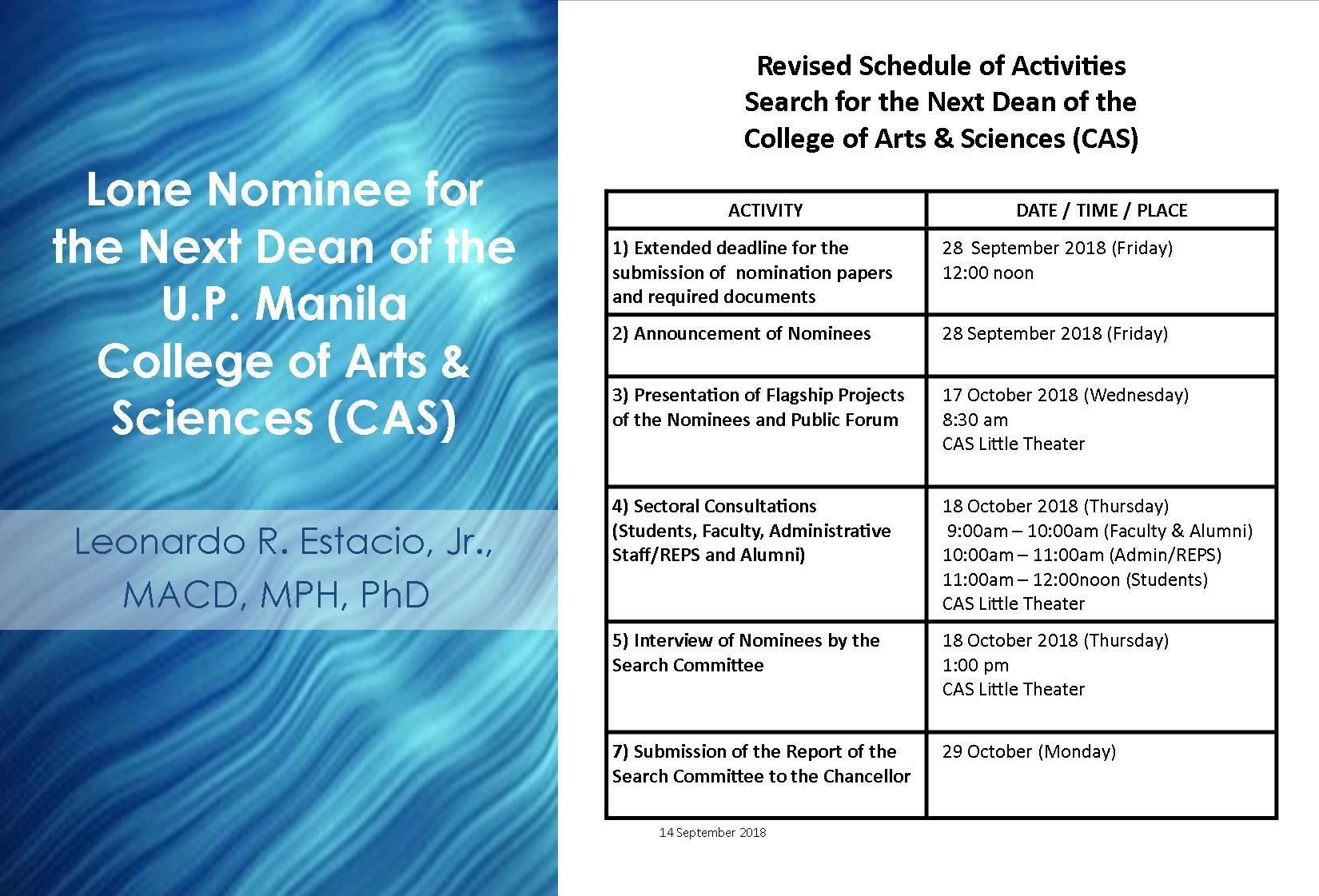 Lone Nominee for the CAS Deanship: Leonardo R. Estacio, Jr., MACD, MPH, PhD