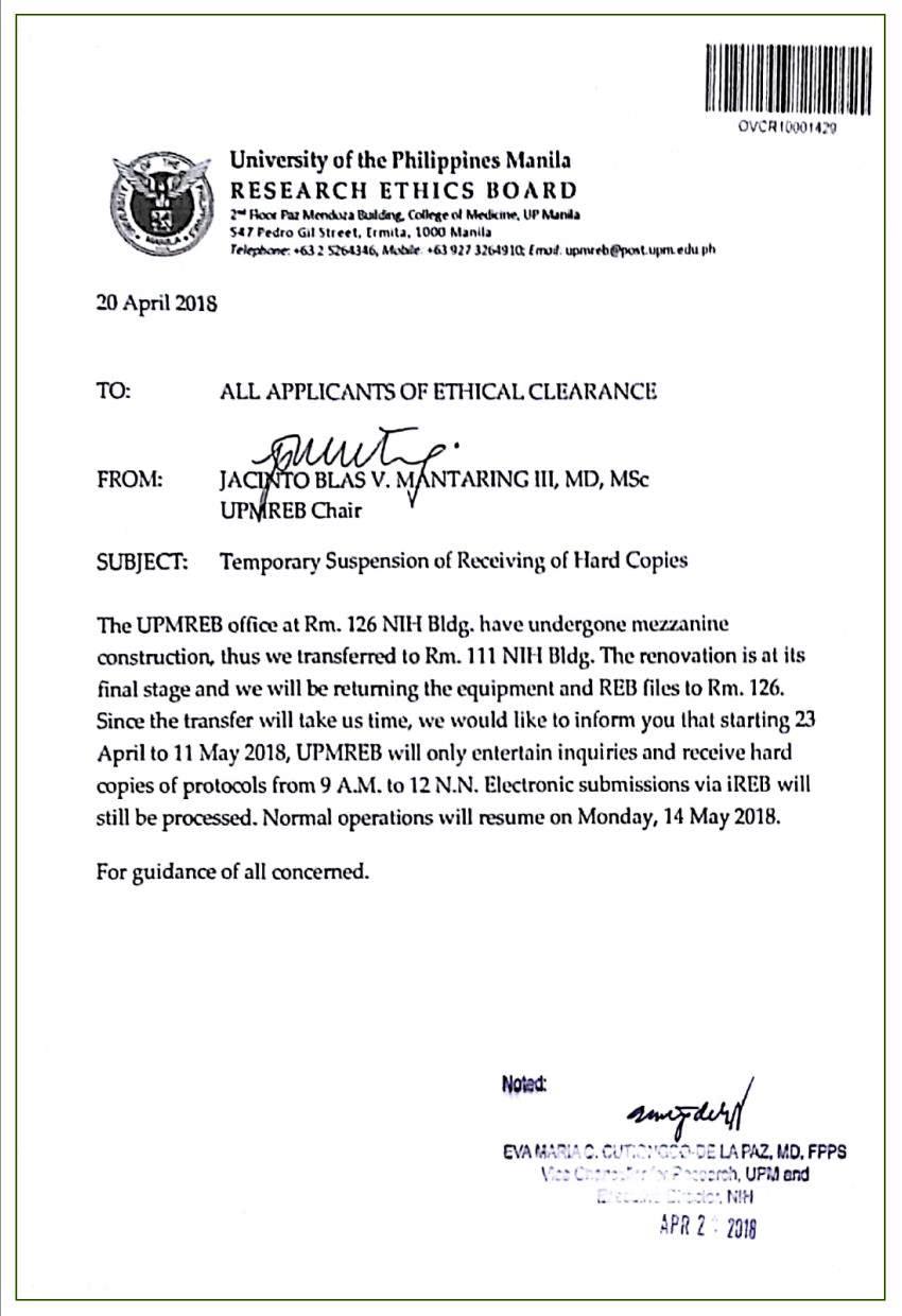 UPM-REB Memo: Temporary Suspension of Receiving of Hard Copies