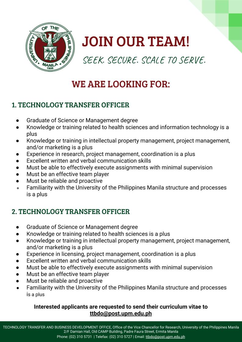 UPM-TTBDO looking for 2 Technology Transfer Officers