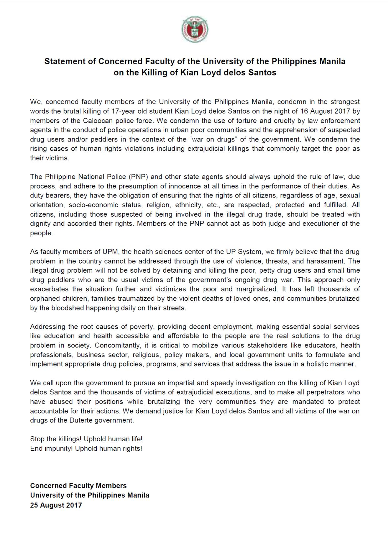 Statement of Concerned UPM Faculty on the killing of Kian Loyd delos Santos (Updated)