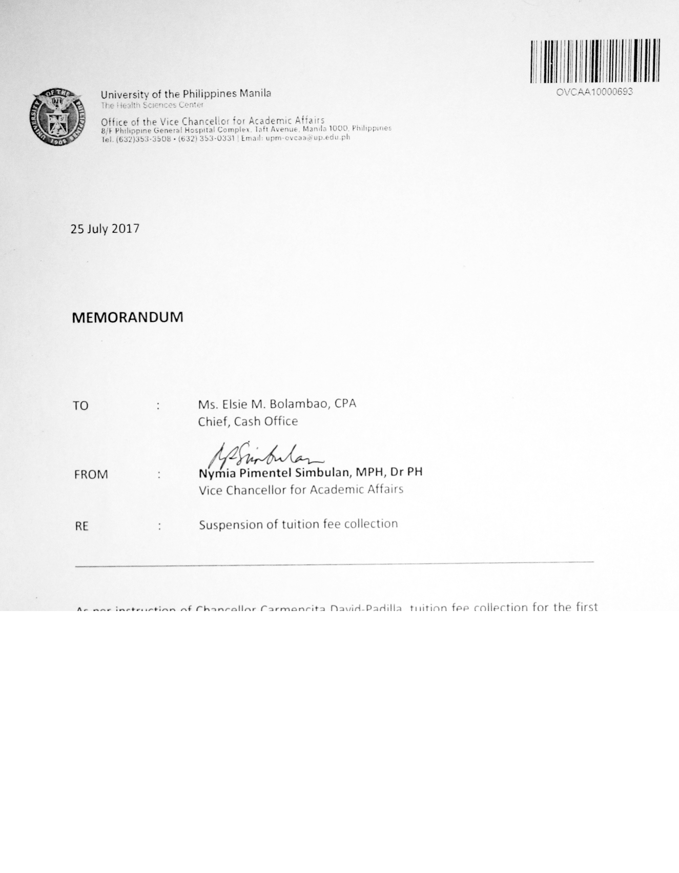 Memo No. PDLC 17-21B: No tuition and other school fees will be collected by the UP System this semester