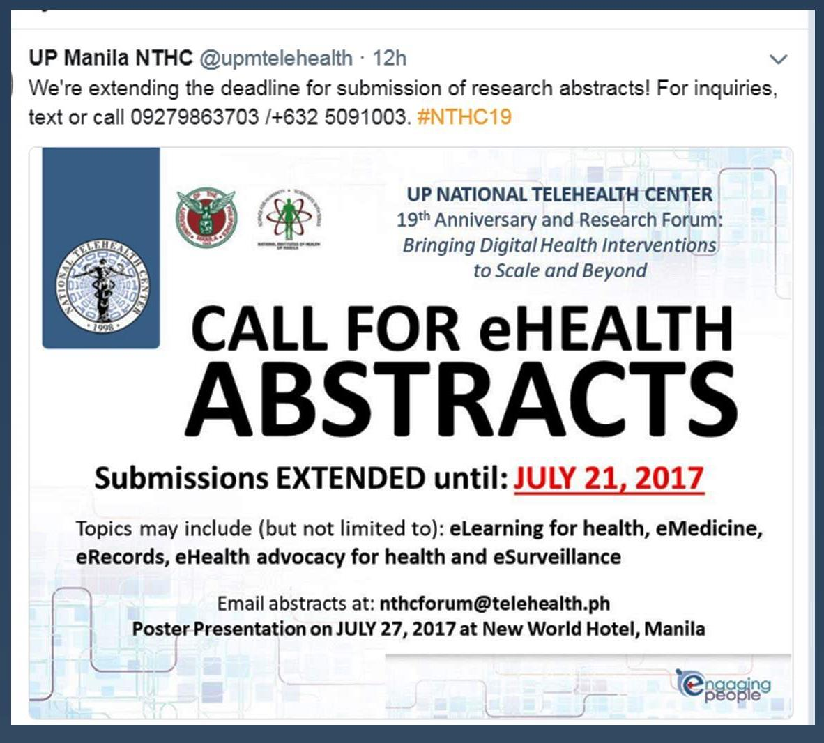 Call for Abstracts: “NTHC@19: Bringing Digital Health Interventions to Scale and Beyond” (New Deadline: 21 July 2017)