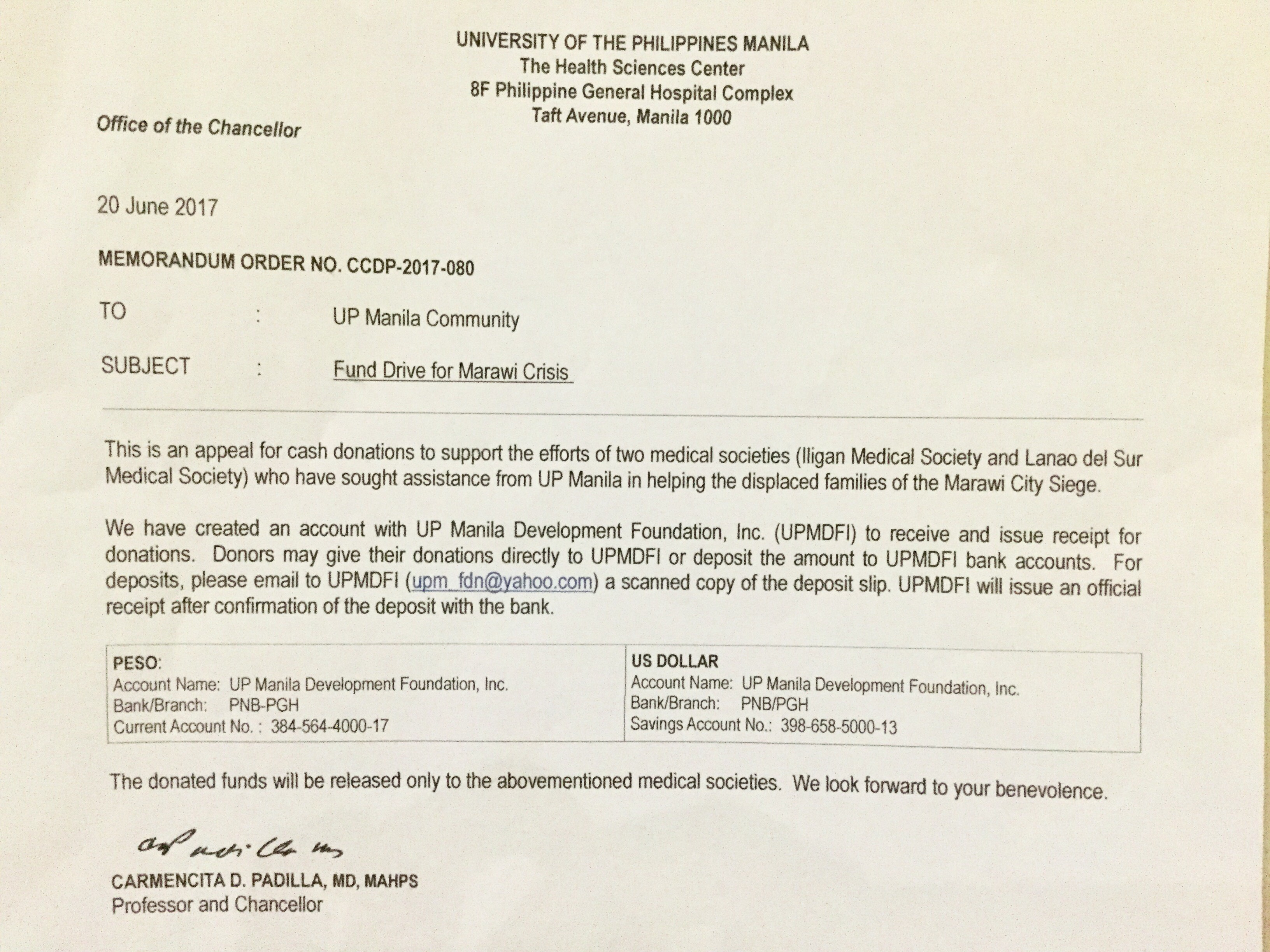 Office of the Chancellor: “Fund Drive for Marawi Crisis”