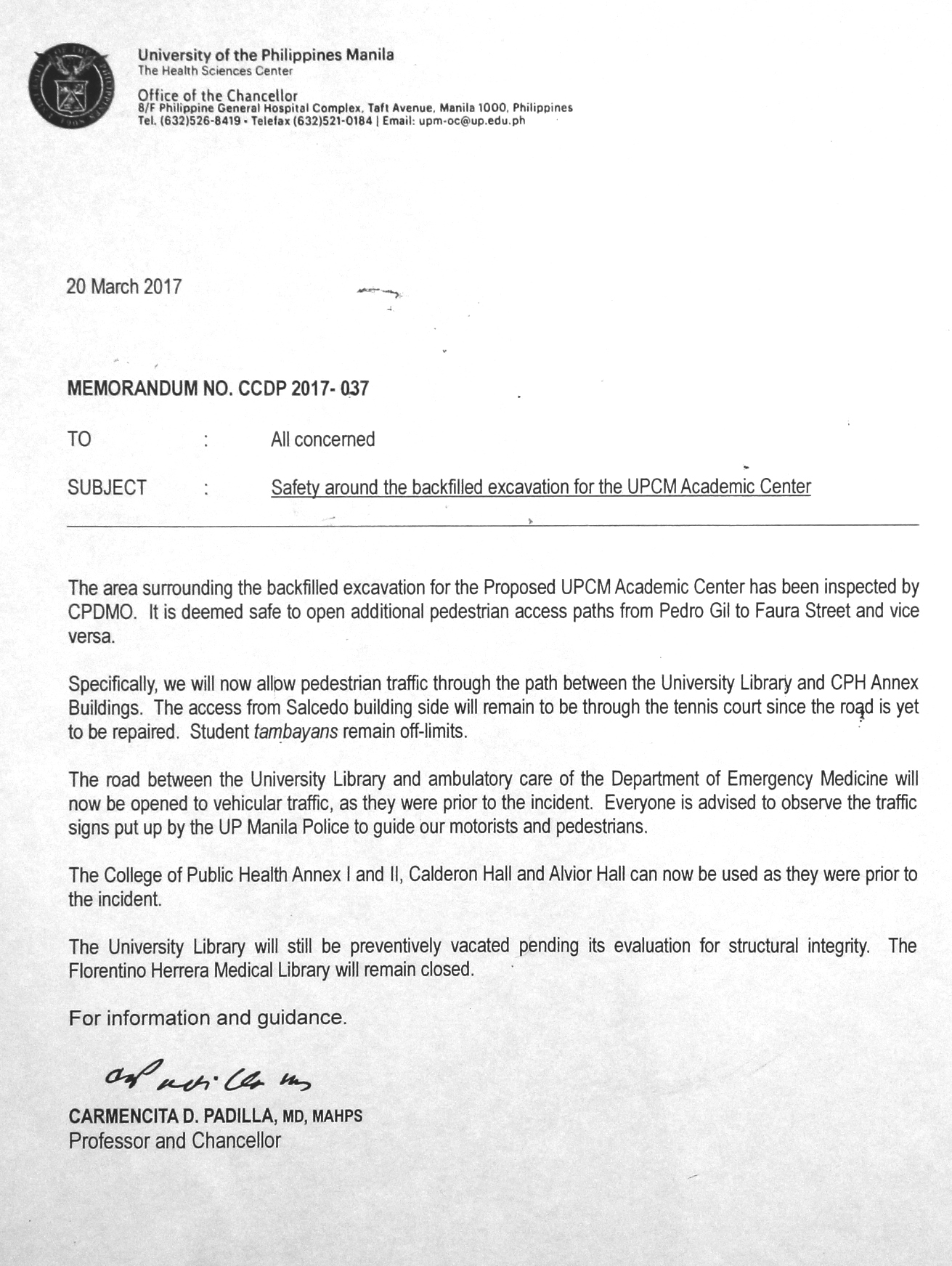 Memo: UPDATE on UPCM Academic Center site (as of 27 March 2017)