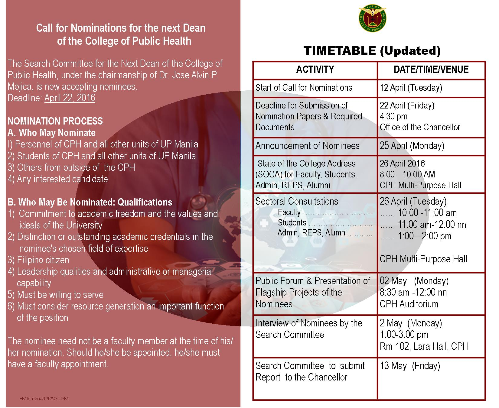 (UPDATED) Call for Nominations for the next Dean of the College of Public Health