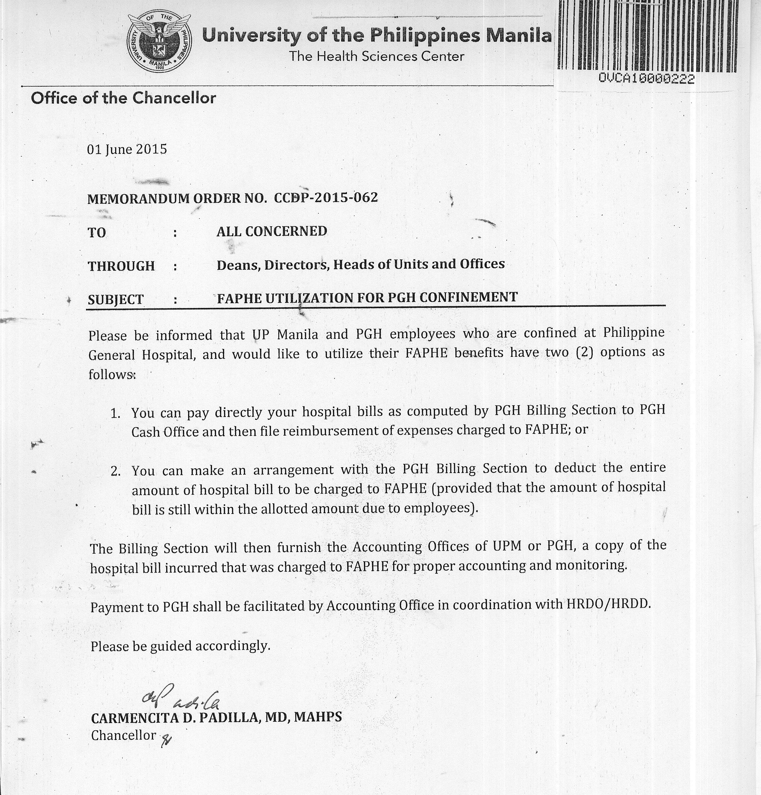 For UPM & PGH Employees: “FAHPE Utilization for PGH Confinement” (Memo No. CCDP-2015-062)