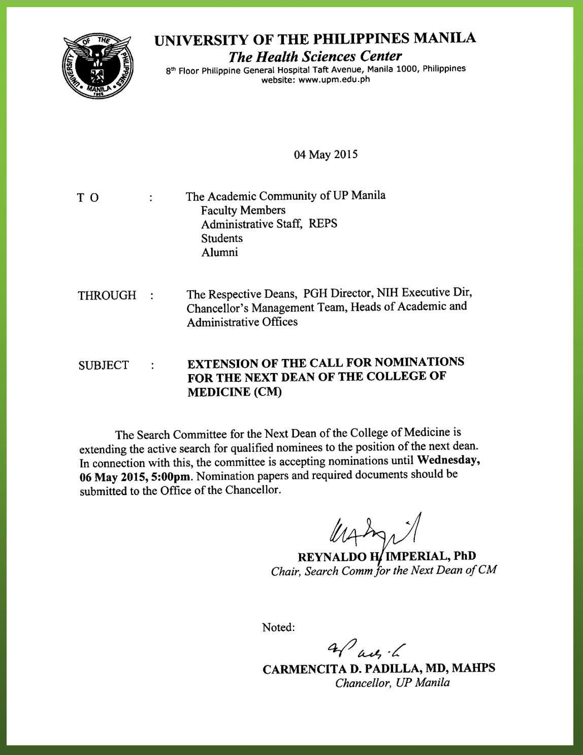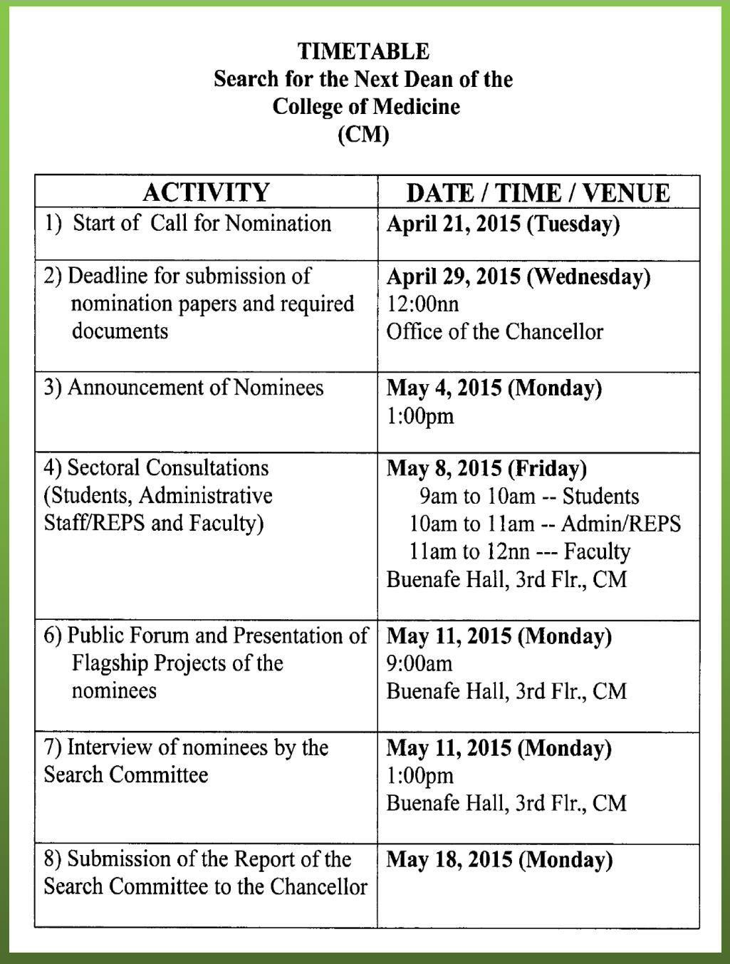 Call for Nominations for the Next Dean of the College of Medicine (Deadline: 29 April 2015)