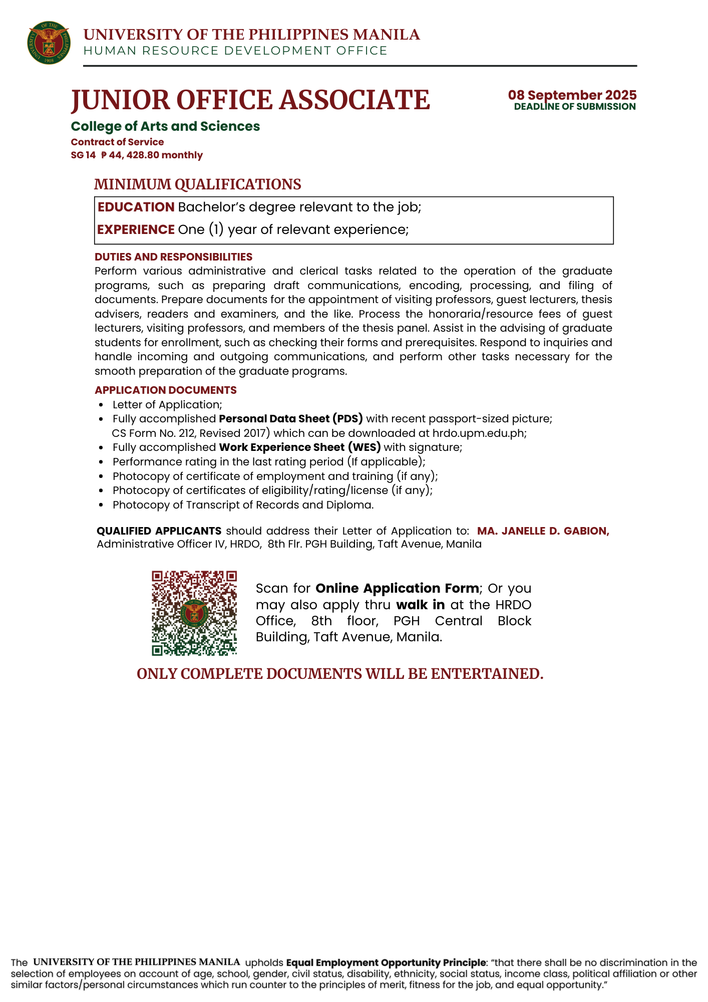 For inquiries, kindly email us at upm-hrdo-hiring@up.edu.ph or you may call us at 88141-228