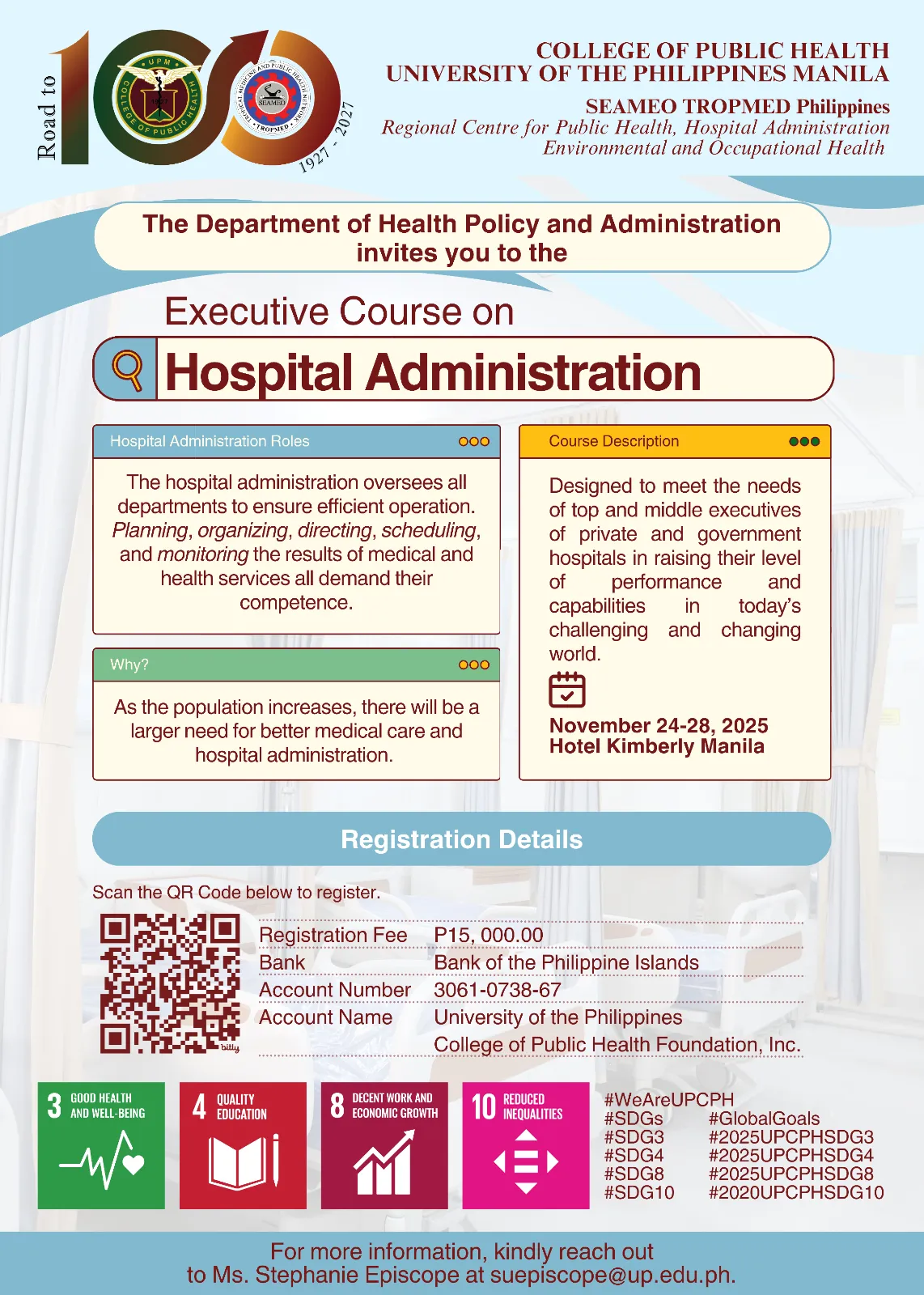 The Department of Health Policy and Administration, College of Public Health, University of the Philippines Manila, invites you to the Executive Course on Hospital Administration on 17-21 November 2025 at Hotel Kimberly Manila.