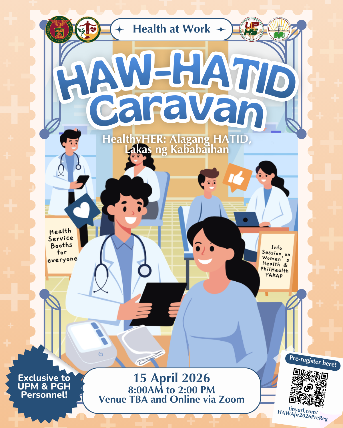 In celebration of the World Day for Safety and Health at Work, the Healthy University Office, in partnership with UP Health Services and the University Library, invites all members of the UPM community to ๐๐๐๐ฅ๐ญ๐ก ๐๐ญ ๐๐จ๐ซ๐ค: ๐๐๐๐ฅ๐ญ๐ก ๐๐ฌ๐ฌ๐๐ฌ๐ฌ๐ฆ๐๐ง๐ญ, ๐๐๐ฌ๐ญ๐ข๐ง๐ , ๐๐ฆ๐ฆ๐ฎ๐ง๐ข๐ณ๐๐ญ๐ข๐จ๐ง, ๐๐ง๐ ๐๐๐ฆ๐จ๐ง๐ฌ๐ญ๐ซ๐๐ญ๐ข๐จ๐ง ๐๐๐ซ๐๐ฏ๐๐ง (๐๐๐: ๐๐๐๐๐ ๐๐๐ซ๐๐ฏ๐๐ง). With the theme โ๐๐๐๐ฅ๐ญ๐ก๐ฒ๐๐๐: ๐๐ฅ๐๐ ๐๐ง๐ ๐๐๐๐๐, ๐๐๐ค๐๐ฌ ๐ง๐ ๐๐๐๐๐๐๐ข๐ก๐๐งโ, this initiative brings essential preventive and promotive health services directly to the UP Manila and PGH community. This activity will be held on ๐๐ ๐๐ฉ๐ซ๐ข๐ฅ ๐๐๐๐, Venue TBA. There will be health service booths open to everyone and a special health information session focusing on womenโs health ๐ช
