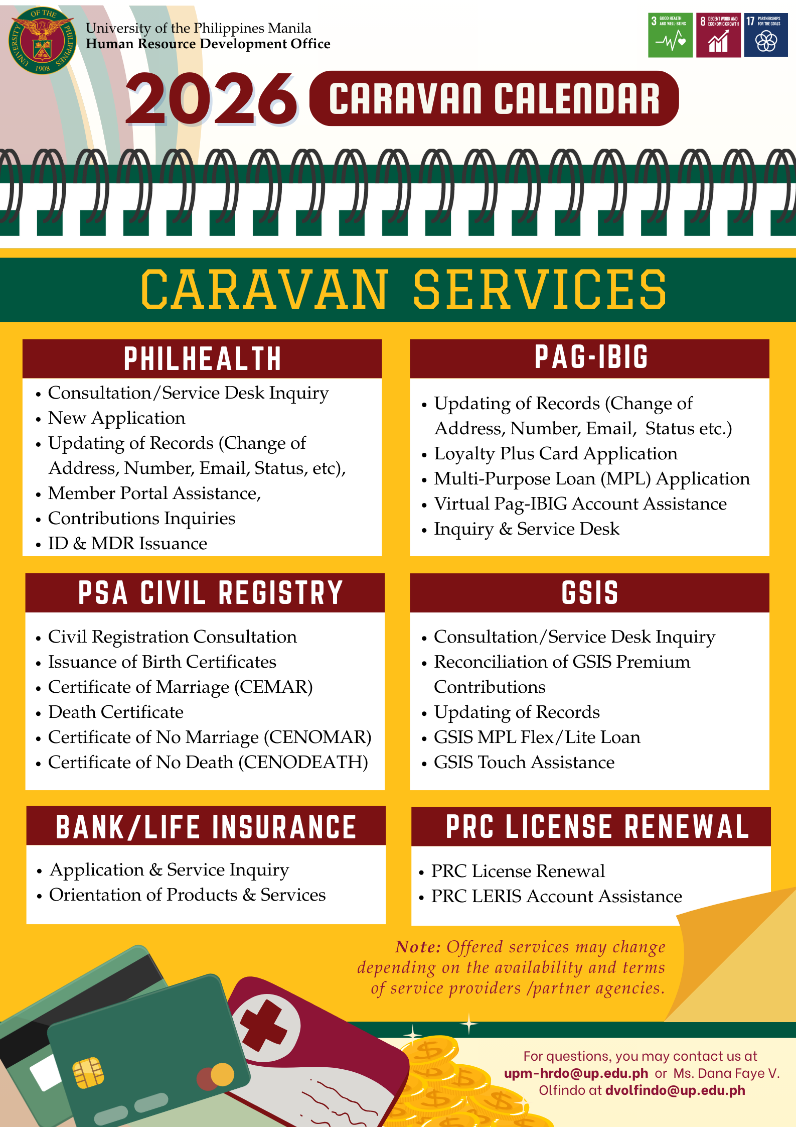 The Human Resource Development Office (HRDO) in its commitment to continuously provide services to the UP Manila community, happily announces the schedule of the 2026 HRDO Caravan Series: Government Services Access Express.