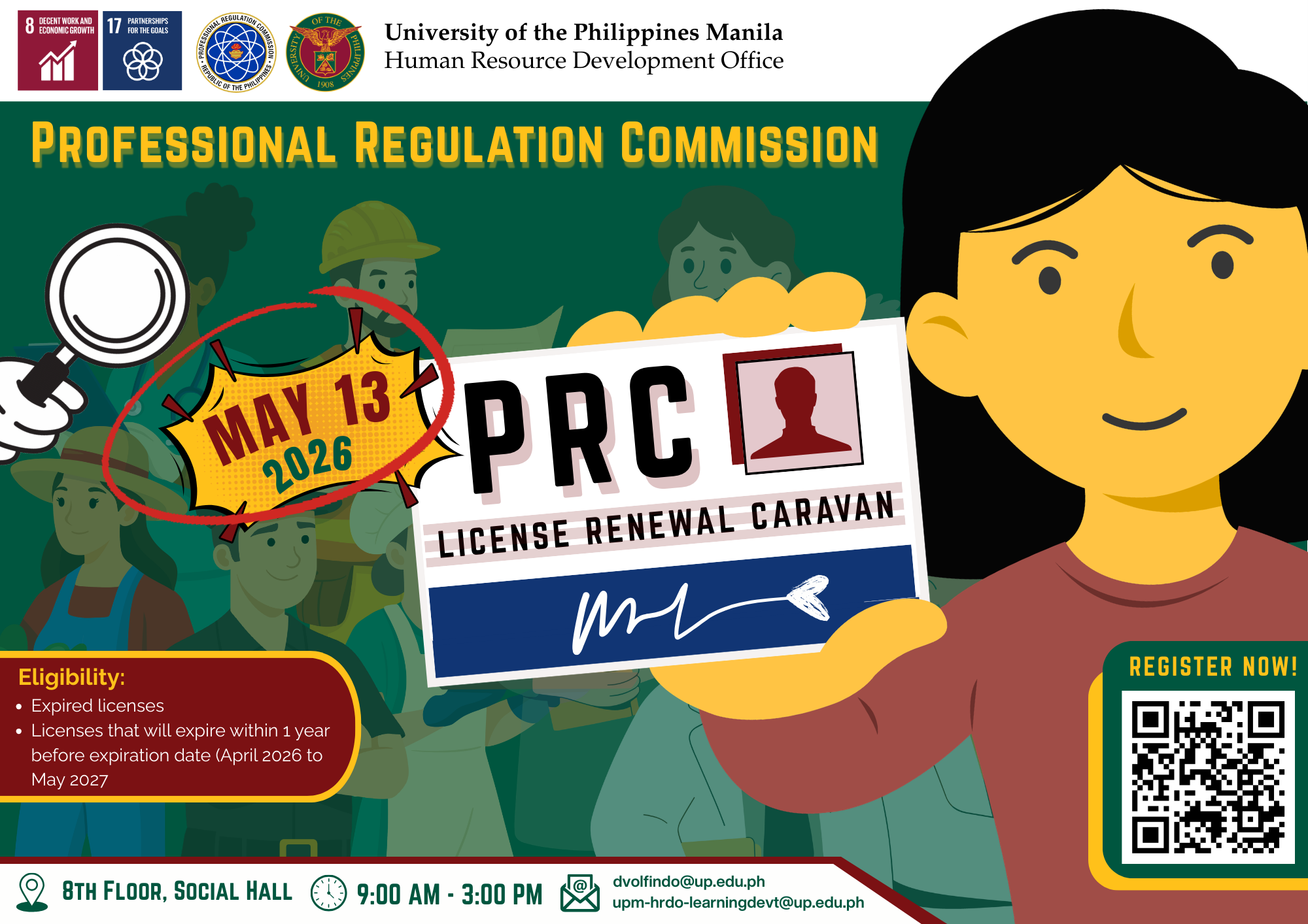 The Human Resource Development Office (HRDO) in its continuous pursuit of providing services to the UP Manila community through the HRDO Caravan Series: Government Services Access Express, will partner with the Professional Regulation Commission to conduct a PRC License Renewal Caravan on May 13, 2026, from 9:00 AM to 3:00 PM.
