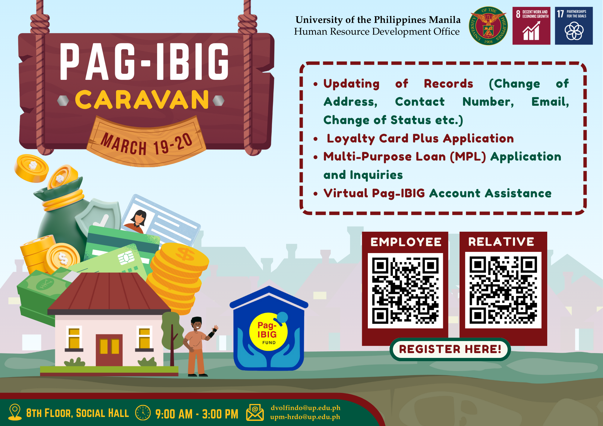 The UP Manila HRDO in its pursuit of providing services to the UP Manila community, happily announces its partnership with theย Pag-IBIG Fund Intramurosย to conduct theย Pag-IBIG Caravanย onย March 19-20, 2026,ย fromย 9:00 AM to 3:00 PM.ย