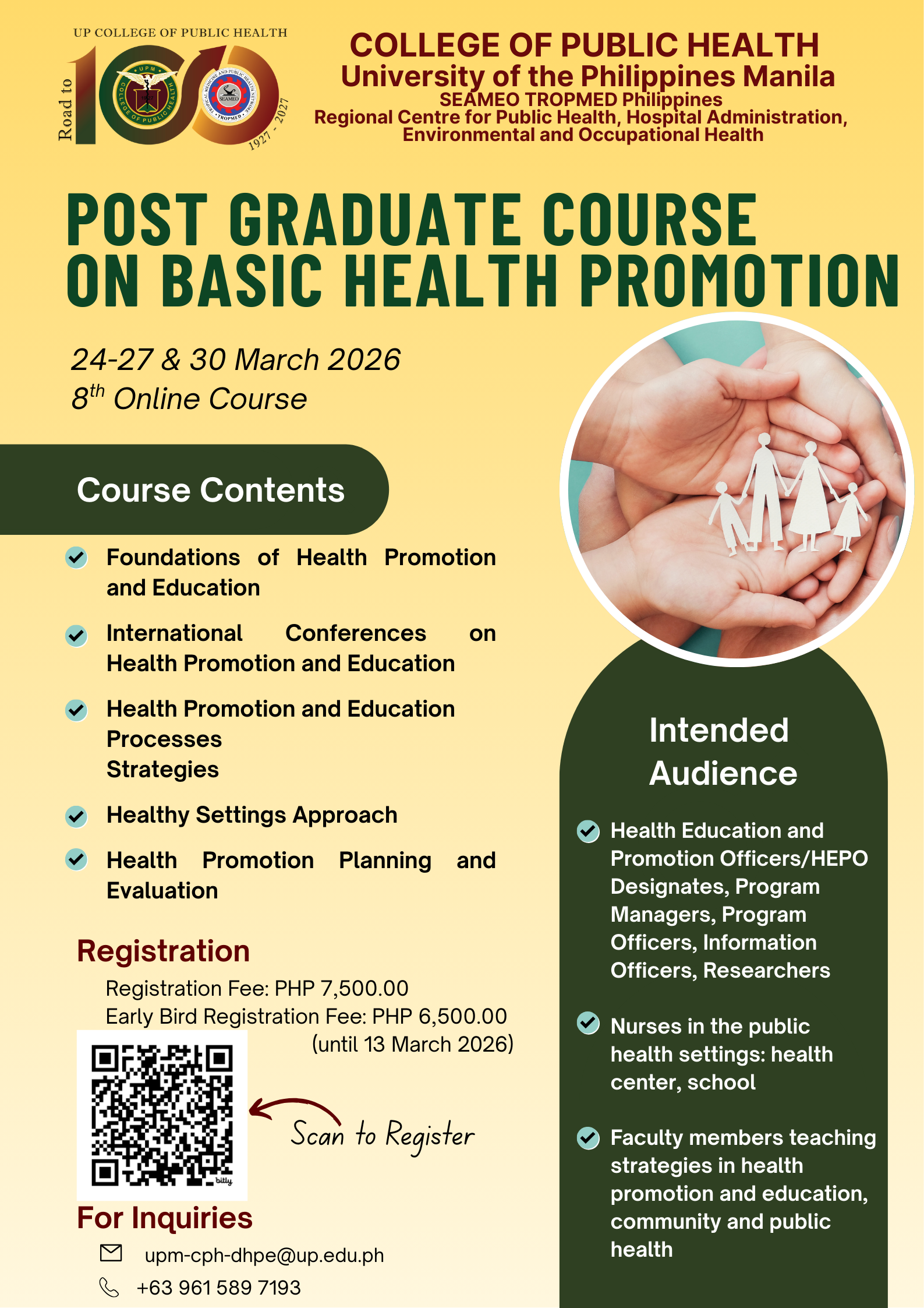The Department of Health Promotion and Education of UP Manila College of Public Health invites you to the Post Graduate Course on Basic Health Promotion on 24-27 & 30 March 2026. This five-day online course will cover the essential concepts and strategies in health promotion and education.