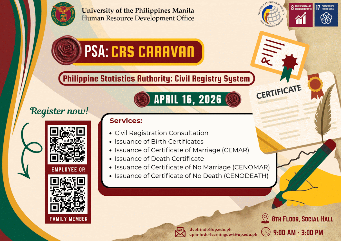 The Human Resource Development Office (HRDO) in its continuous pursuit of providing services to the UP Manila community through the HRDO Caravan Series: Government Services Access Express, will partner with the Philippine Statistics Authority Civil Registry System to conduct a PSA CRS Caravan on April 16, 2026, from 9:00 AM to 3:00 PM.