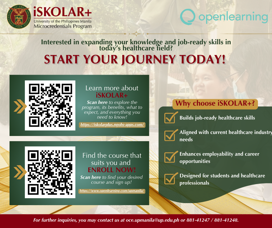 Interested in expanding your knowledge and building job-ready skills in todayโs healthcare field? iSKOLAR+ by the Office of Continuing Education under the University of the Philippines Manila offers flexible microcredentials designed to help you stay competitive and career-ready.