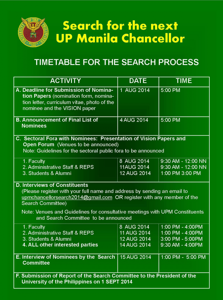 NEWS: TIMETABLE of the Search Process for the new UP Manila Chancellor
