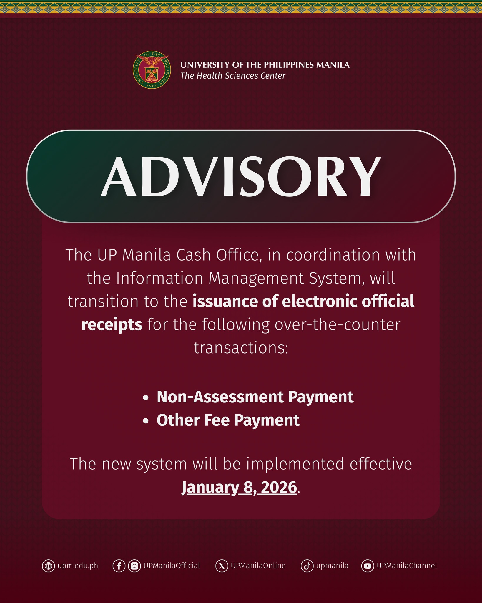 Please be informed that effective January 8, 2026, the UP Manila Cash Office, in coordination with the Information Management System, will transition to the issuance of electronic official receipts for the following over-the-counter transactions: