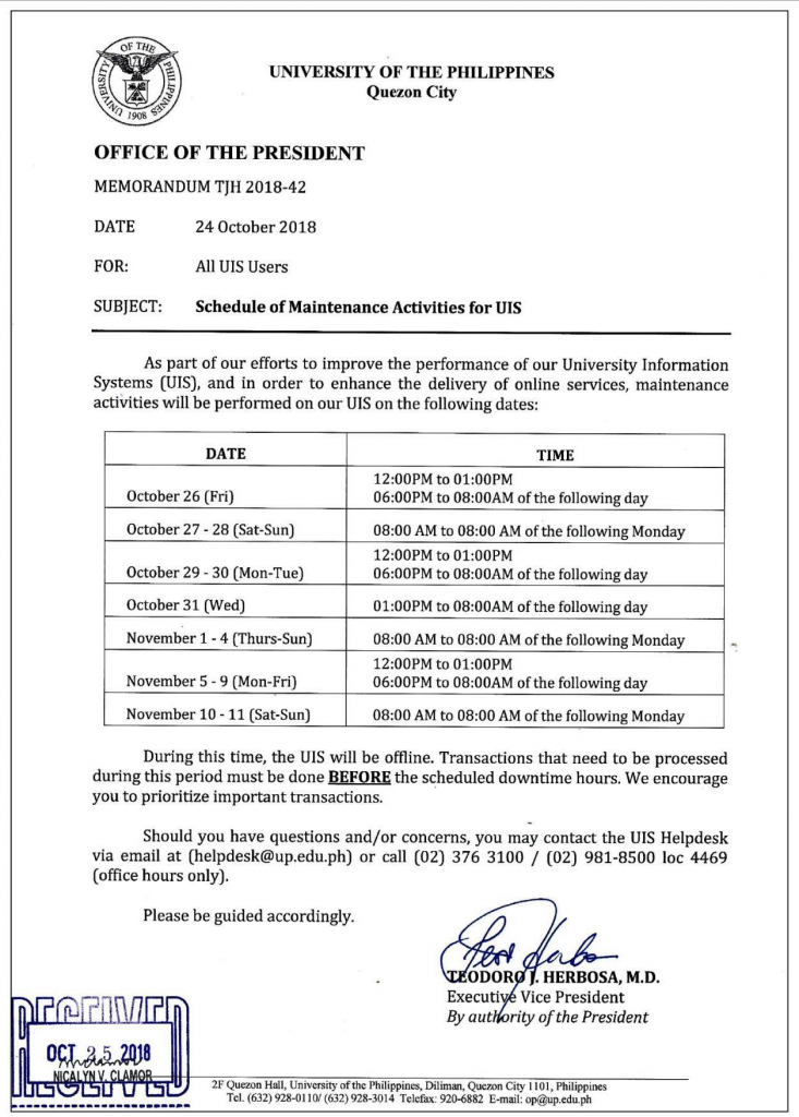 Memo No. TJH 2018-42 dated 24 Oct 2018 Re Schedule of Maintenance Activities for UIS.pdf