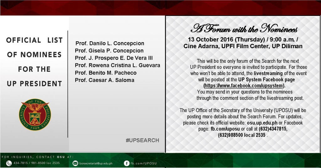 Based on this, the Board then unanimously accepted the nominations of the following as candidates for the UP Presidency: