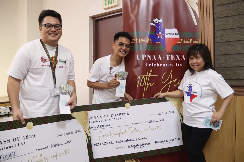 UPNAA Texas and UPCN 1989 representative Debbie Butuyan (right) awards the cash aid to nursing students (from left) Rovic Kien Gratil and Mark Aguilar.