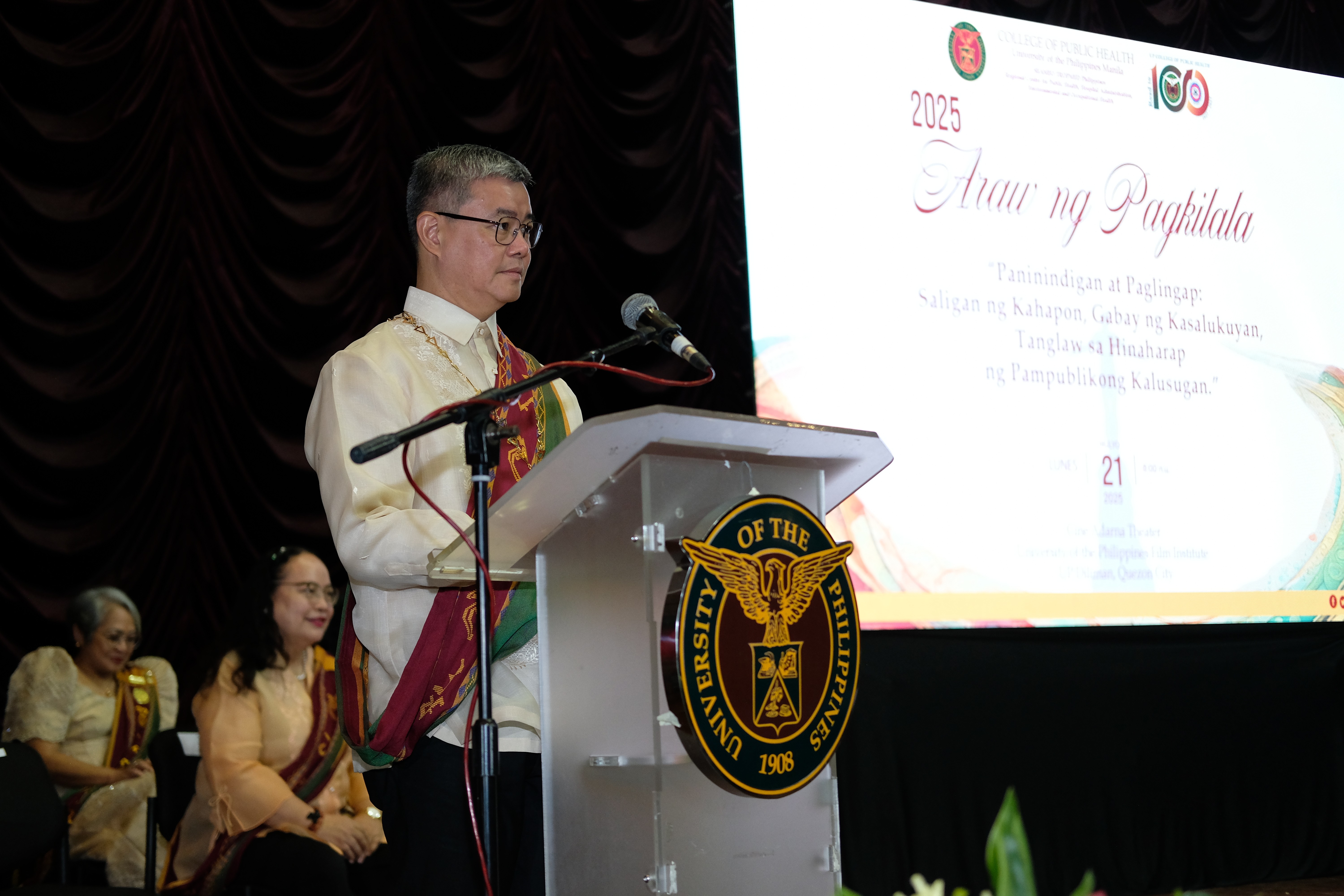 In his message, Dean Fernando B. Garcia, Jr. emphasized, “Ang tema ay paalala sa atin. Ang ating misyon sa pampublikong kalusugan ay hindi nagtatapos sa apat na sulok ng classroom. Kasama dito ang ating kasaysayan, ang mga aral ng kahapon, ang mga hamon ng kasalukuyan—mula sa pandemya, climate change, One Health, hanggang sa mga isyung pampolitikal—at ang pagtanaw sa kinabukasan kung saan kayo na ang magiging lider, tagapag-ugnay, tagapagsalita, at tagapagtanggol ng kalusugan ng mamamayan.”