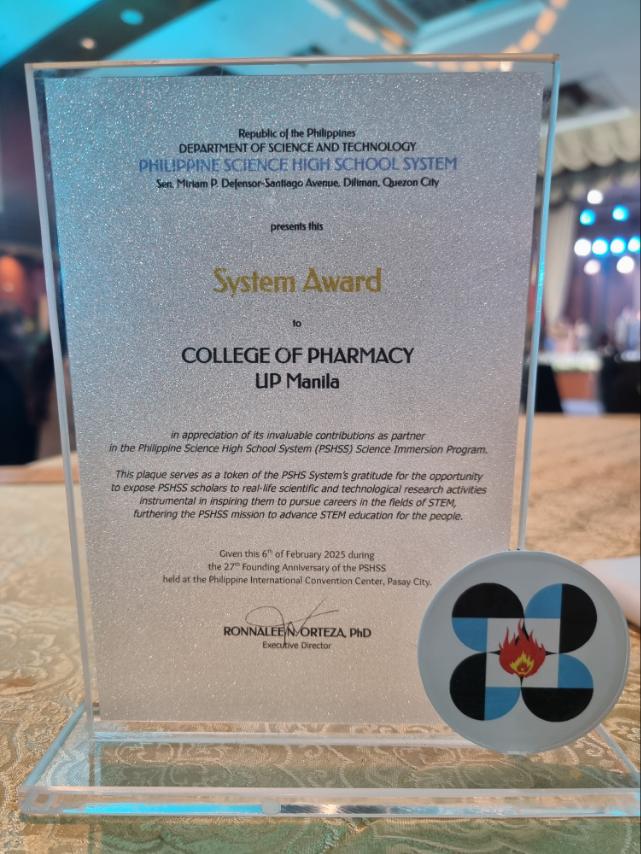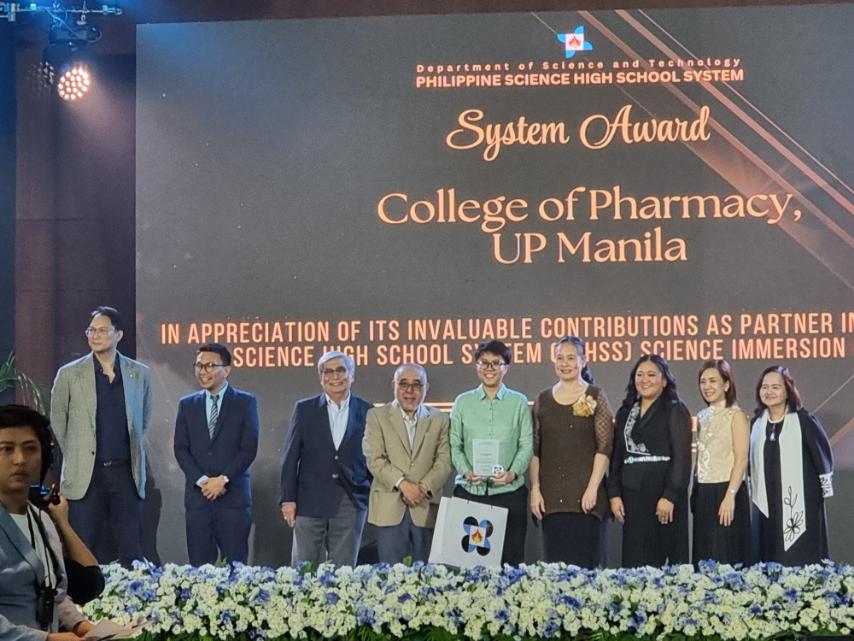 The College of Pharmacy (CP) received a System Award at the 27th Founding Anniversary of the Philippine Science High School System (PSHSS) in recognition of its continued partnership in the Science Immersion Program (SIP) given on Feb. 6, 2025, at the Philippine International Convention Center.