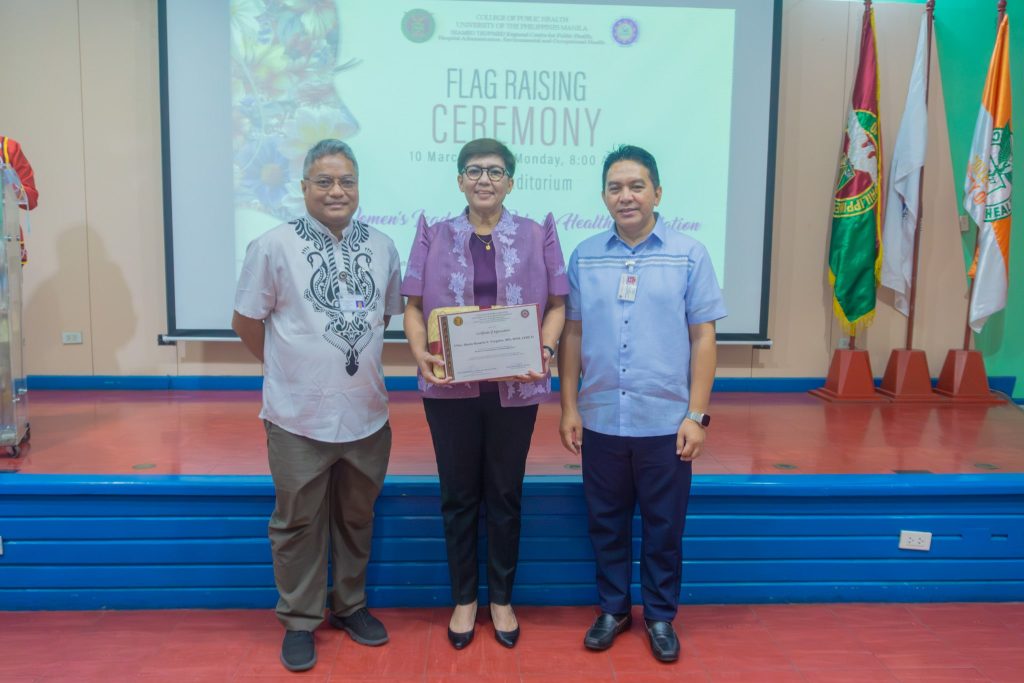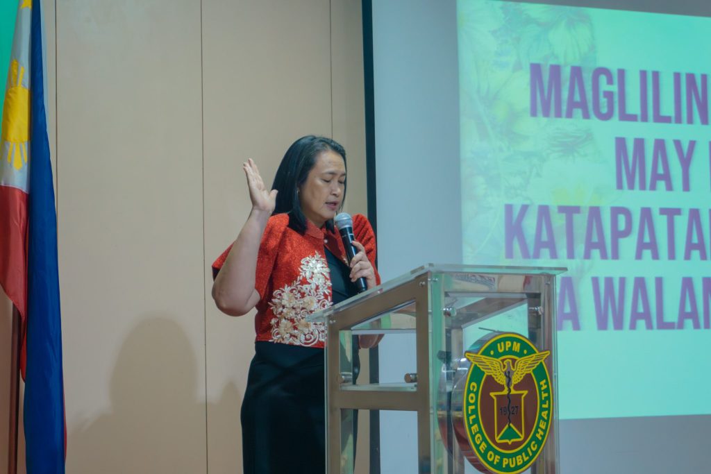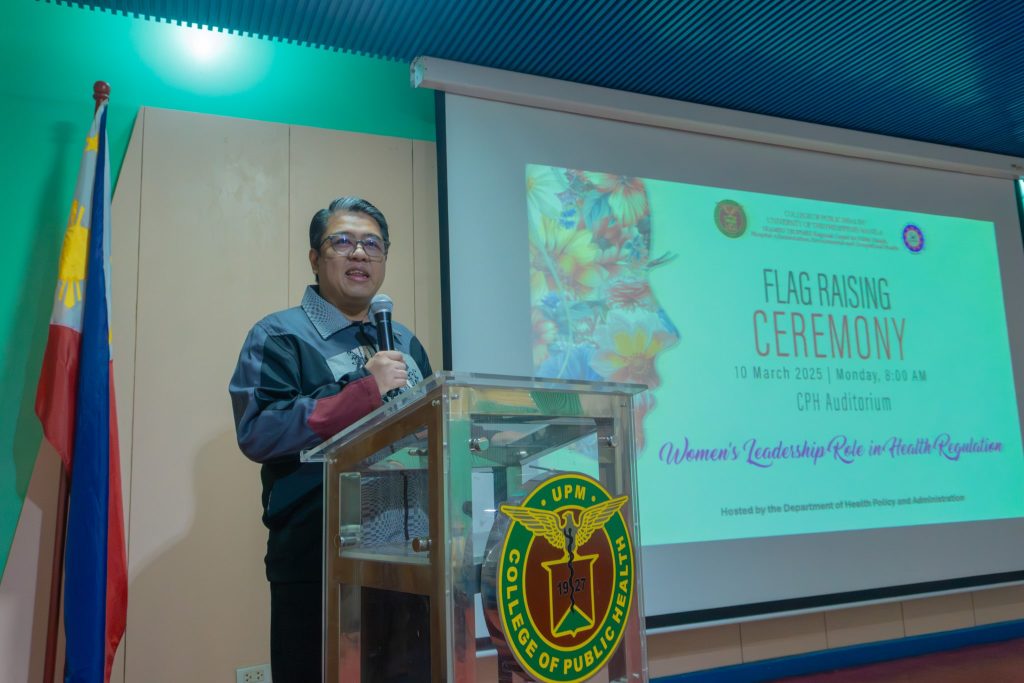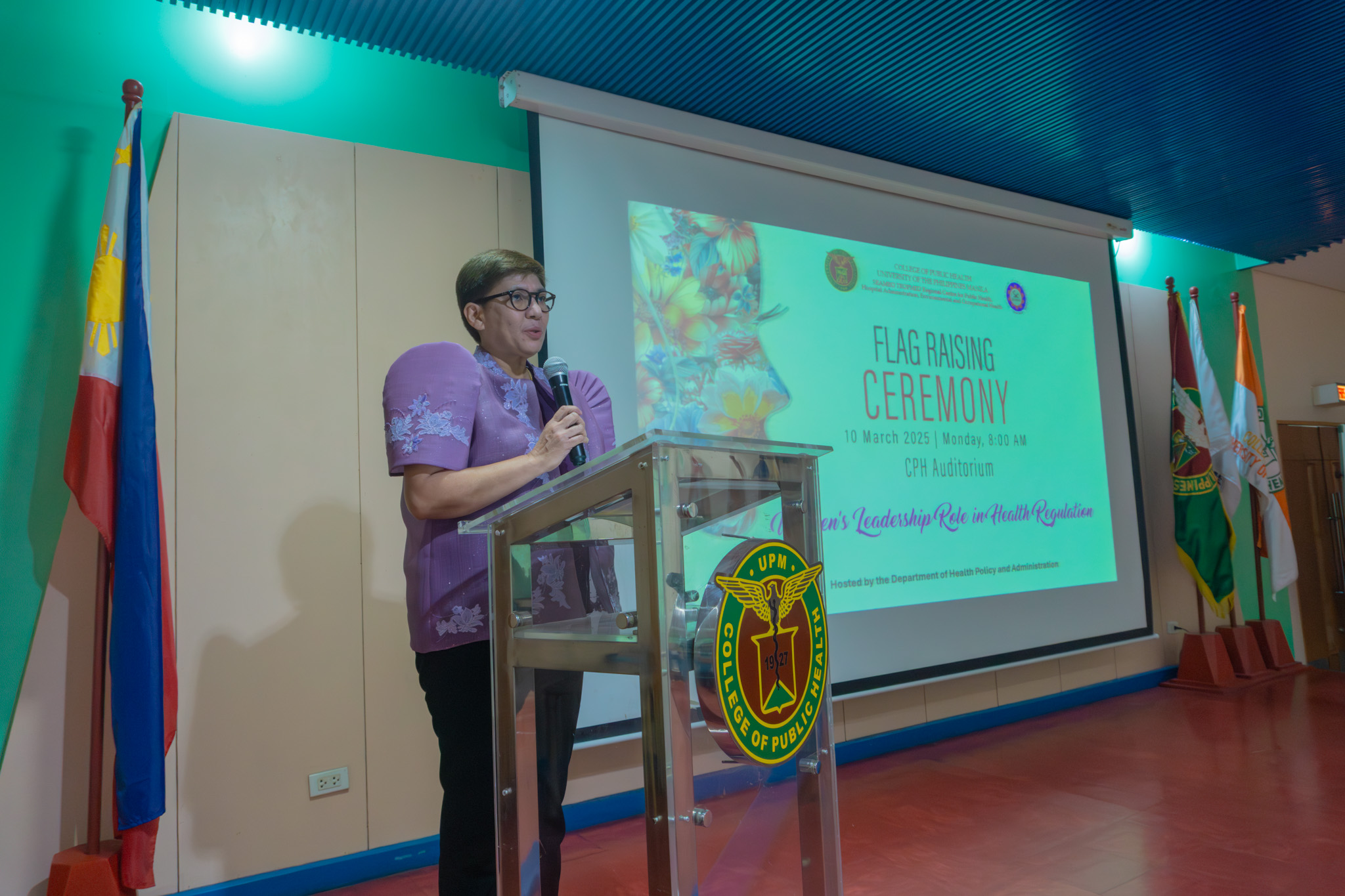 Dr. Maria Rosario Singh-Vergeire, undersecretary for the public health services of the Department of Health (DOH), called on the College of Public Health (CPH) to support the DOH in advancing health regulations in the Philippines, highlighting the importance of academic institutions assisting in regulatory reforms through research, policy-making, and training programs, during the flag raising ceremony on Mar. 10, 2025, held at the CPH Auditorium.