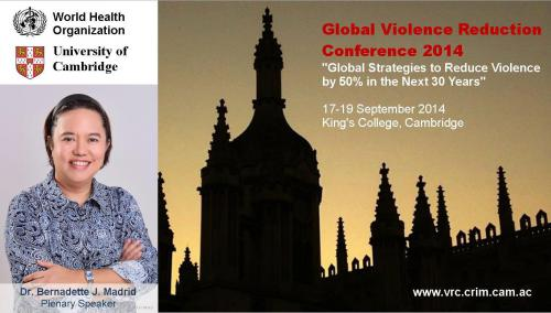Dr. Bernadette J. Madrid, Director of the UP-PGH Child Protection Unit, will be a plenary speaker in the first ever international conference on reducing violence. The event, known as the Global Violence Reduction Conference 2014, will be held on 17-19 September 2014 at King’s College, Cambridge, United Kingdom.It is organized by the Prevention of Violence Unit of the World Health Organization (WHO) and the Violence Research Centre (VRC) of the Institute of Criminology, University of Campbridge. ( For more on the conference, please visit this link: www.vrc.crim.cam.ac.uk/conference)