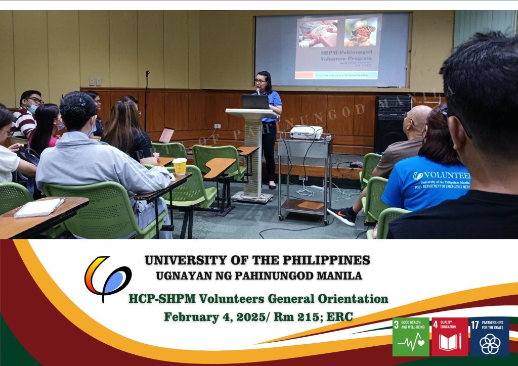Also on Feb. 4, Pahinungod Manila, together with the Department of Family and Community Medicine (DFCM) of PGH, hosted the general orientation for the Hospice Care Program-Supportive Hospice and Palliative Medicine. DFCM fellows discussed common symptoms, management, and communication strategies, focusing on wound care management and defining expectations for volunteers who will be deployed in the palliative ward. Attendees include students from CAS, the College of Medicine, College of Nursing, and College of Public Health, as well as professional nurses.