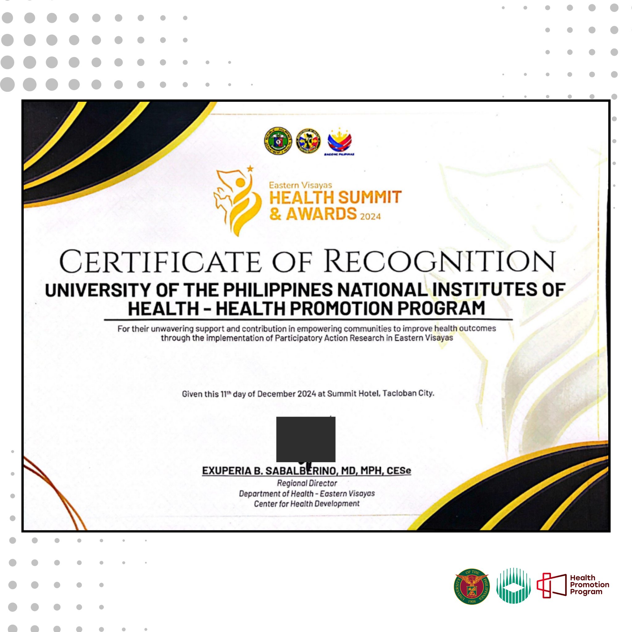 The Health Promotion Program (HPP) of the National Institutes of Health (NIH) was recognized by the Eastern Visayas Center for Health Development (EVCHD) during the Eastern Visayas Health Summit and Awards 2024 held last Dec. 11, 2024 in Tacloban City. The award acknowledges HPP’s unwavering commitment to empowering communities and improving health outcomes through the implementation of Participatory Action Research in Eastern Visayas.