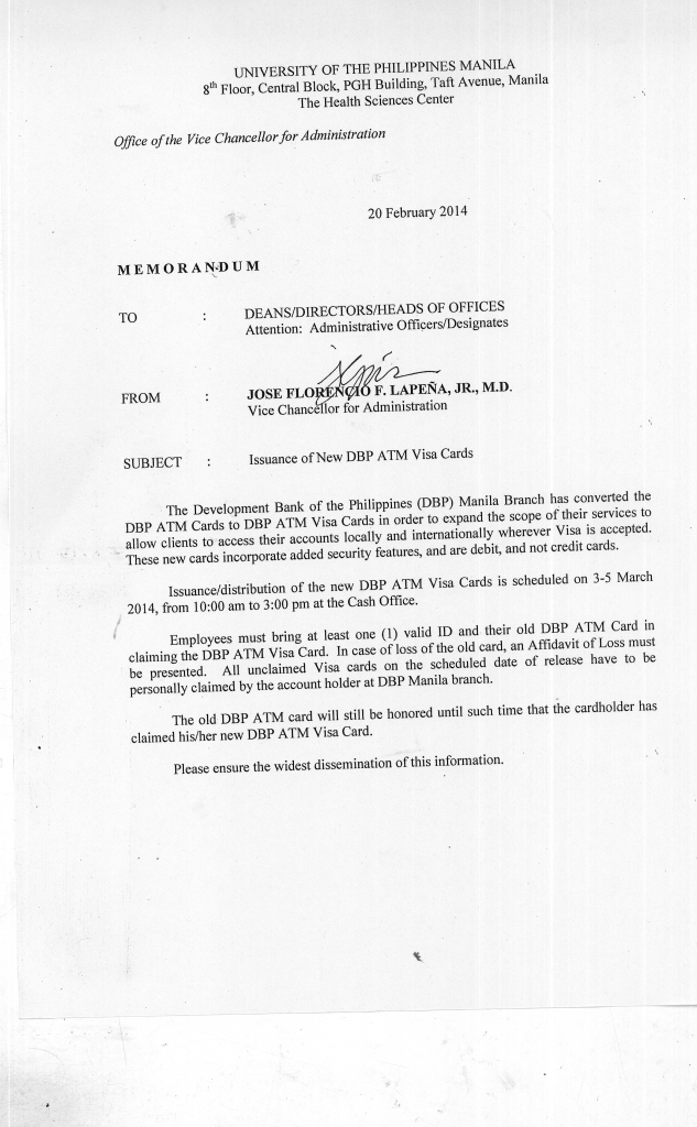 Memorandum of the Vice-Chancellor for Administration: Issuance of New DBP ATM Cards