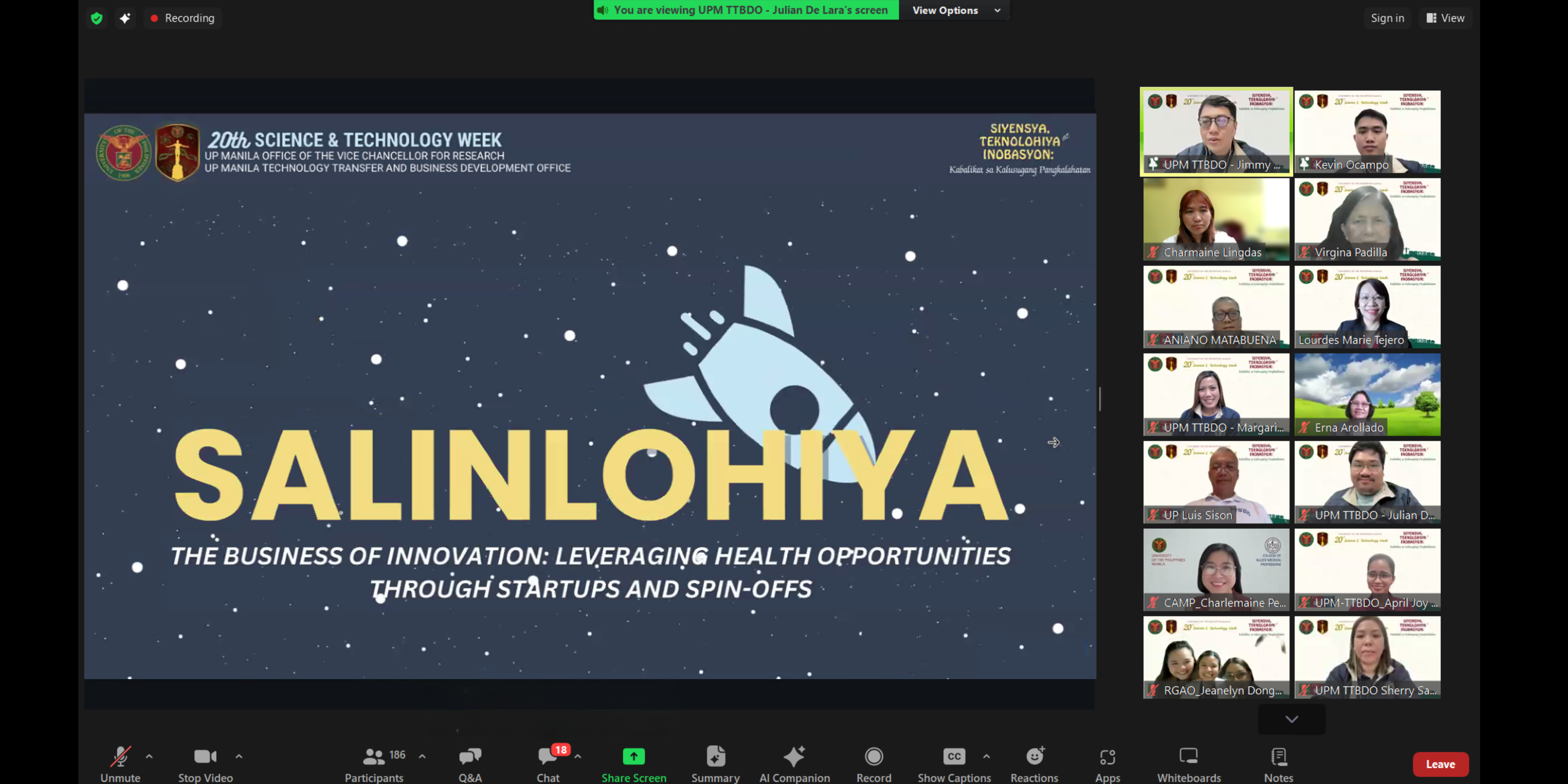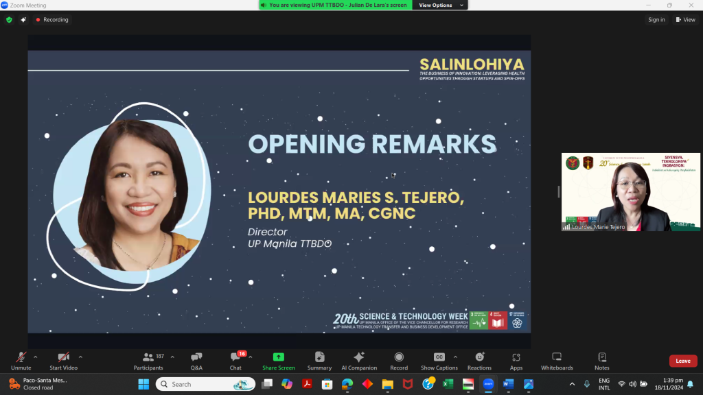 The University of the Philippines (UP) Manila hosted Salinlohiya 2024 as part of Day 1 of the 20th Science and Technology Week, held on November 18, 2024, at the Henry Sy Sr. Hall. Presented by the UP Manila Technology Transfer and Development Office (TTBDO), the event carried the theme “The Business of Innovation: Leveraging Health Opportunities through Startups and Spin-offs.” It showcased how academic research is transformed into real-world health solutions.