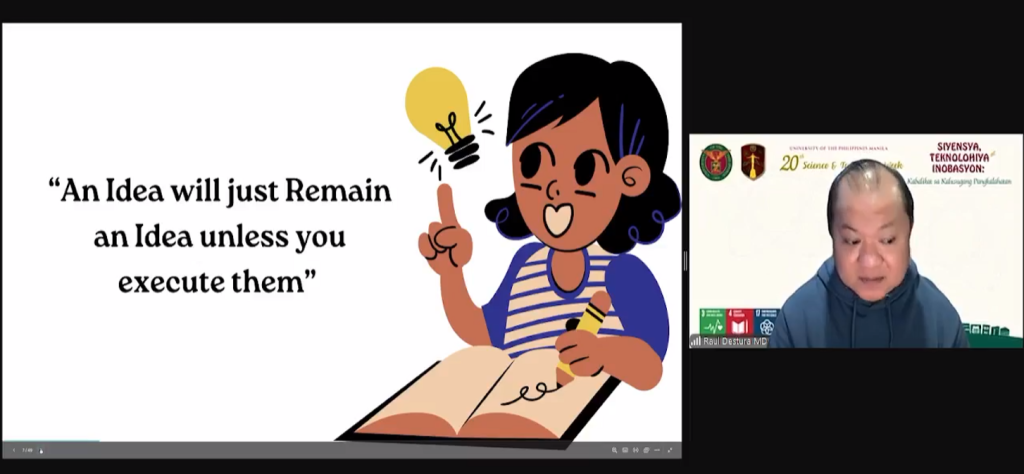 Dr. Raul Destura, CEO of Manila HealthTek Inc., shared his journey in biotechnology, focusing on the development of the Biotek-M™ Dengue Aqua Kit. He introduced the concept of the “Quintuple Helix of Innovation,” a framework that unites academia, industry, government, civil society, and the natural environment. Dr. Destura stressed that “An idea remains just an idea until executed,” emphasizing the importance of collaboration and sustainability in turning research into market-ready solutions.