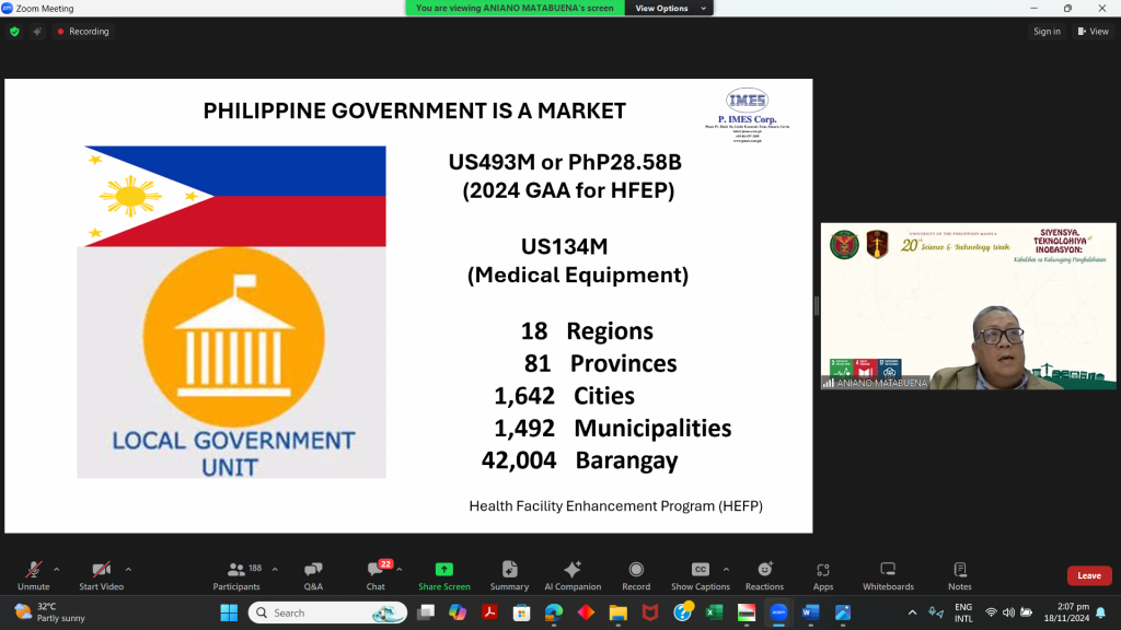 Mr. Aniano Matabuena Jr., executive vice president of P.IMES Corp., provided a snapshot of the medical innovation landscape in the Philippines, pointing to expected sector growth. “The medical device market is projected to grow from $283 million in 2023 to $455 million by 2028,” he noted, driven by lessons learned from the pandemic, particularly in respiratory devices and diagnostic equipment.