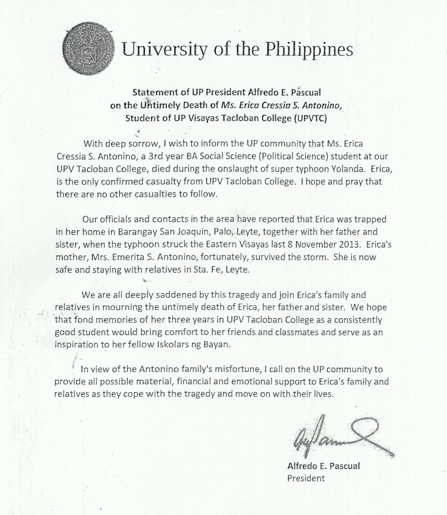 Statement of UP President Alfredo E. Pascual on the Untimely Death of Ms. Erica Cressia S. Antonino, Student of (UPVTC)