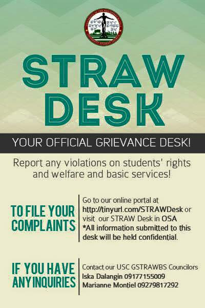 Do you have any students’ rights, welfare, and basic services complaints for the past academic year? Report any violation against you, a friend, your org, etc! Let your USC and OSA know with the STRAW Desk, and we’ll make sure to get to the bottom of it!