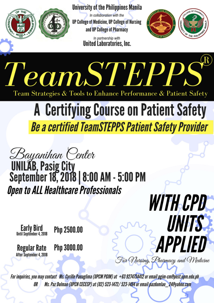 The UP College of Medicine, together with the Colleges of Nursing & Pharmacy, will be holding a Patient Safety Postgraduate Course entitled“TeamSTEPPS ® Foundations Certificate Course” this September 18, 2018, Tuesday, 8:00 am-4pm at the UNILAB Bayanihan Hall, Pasig City. We would like to invite your constituents to participate in this course and be certified Basic TeamSTEPPS Patient Safety providers.