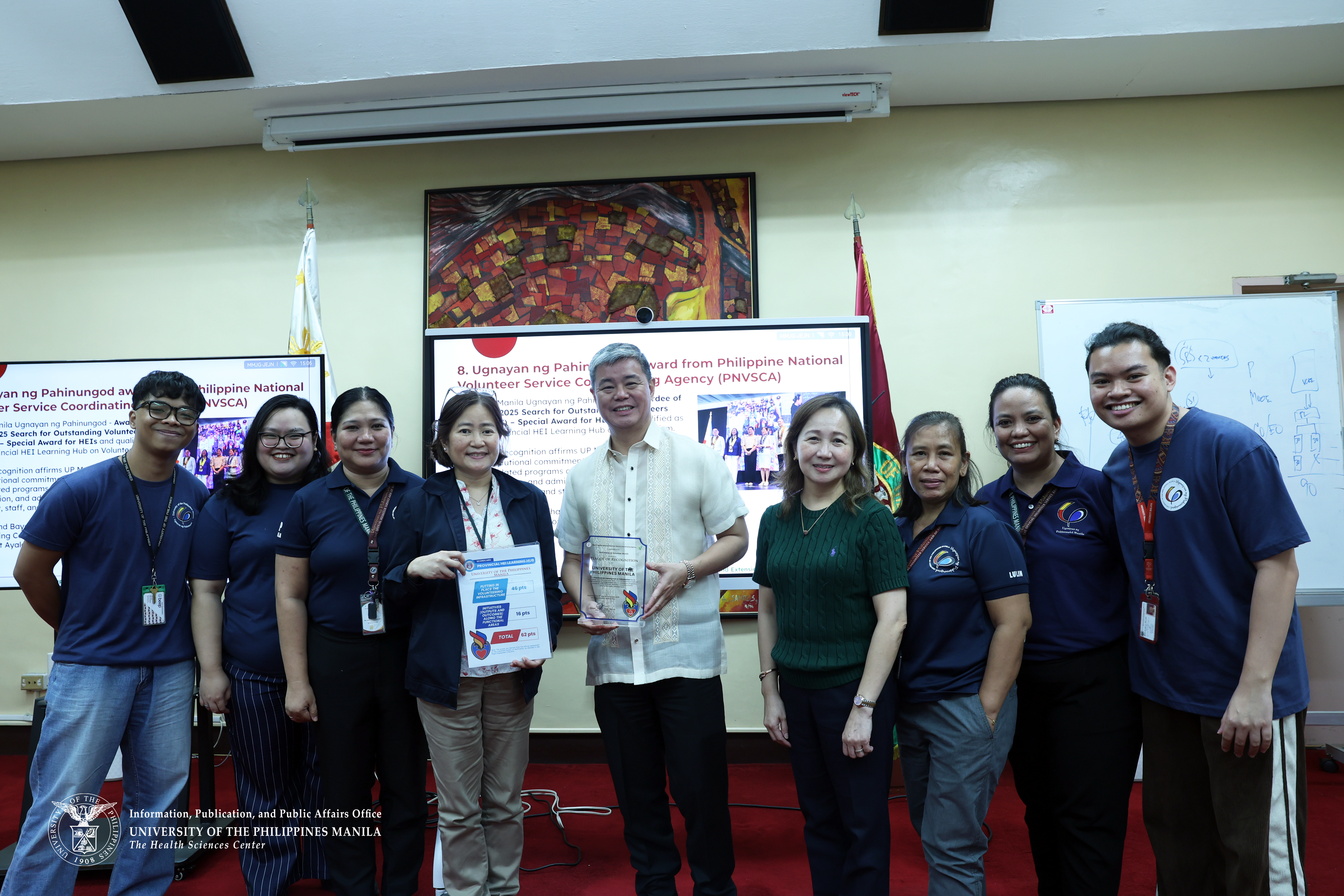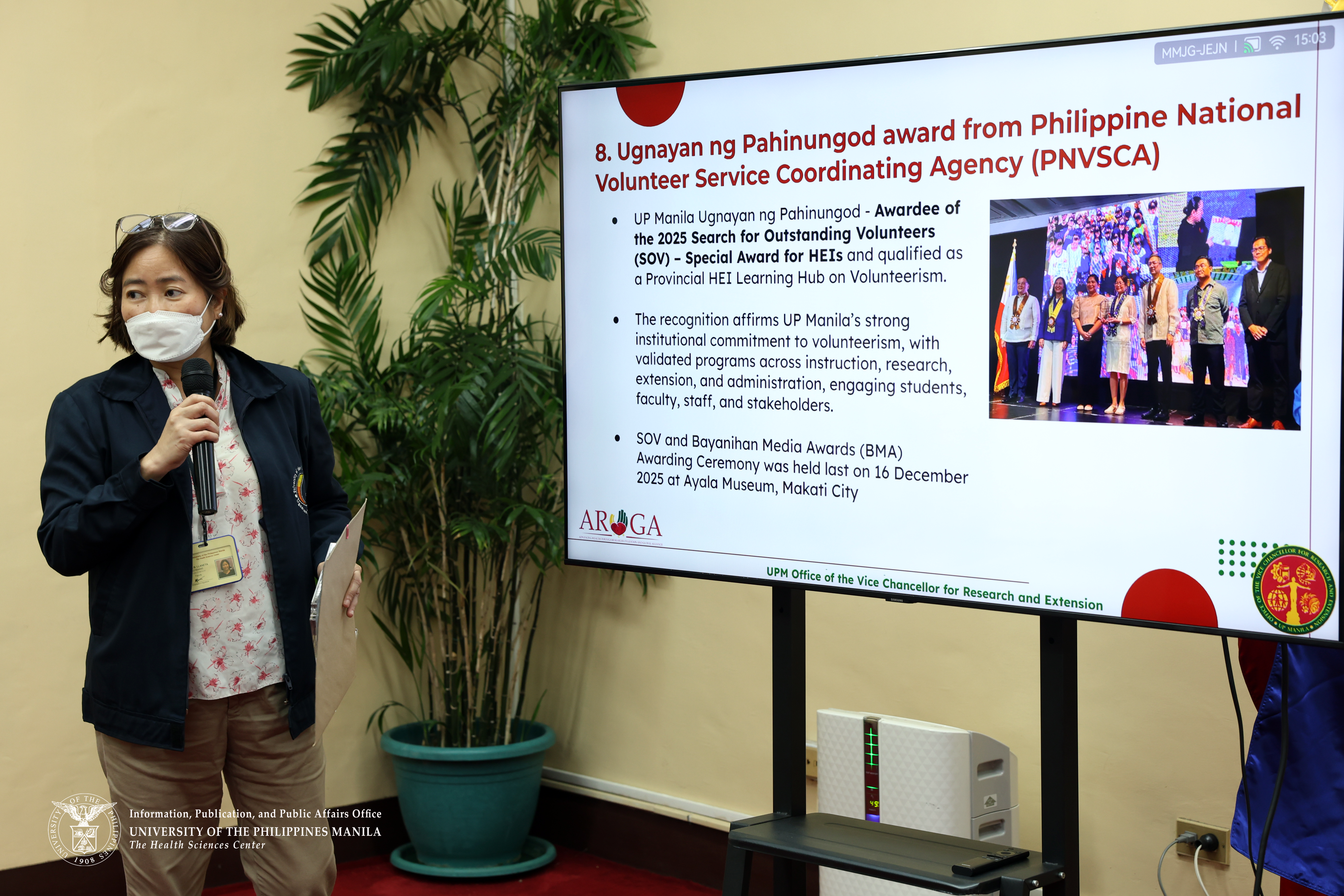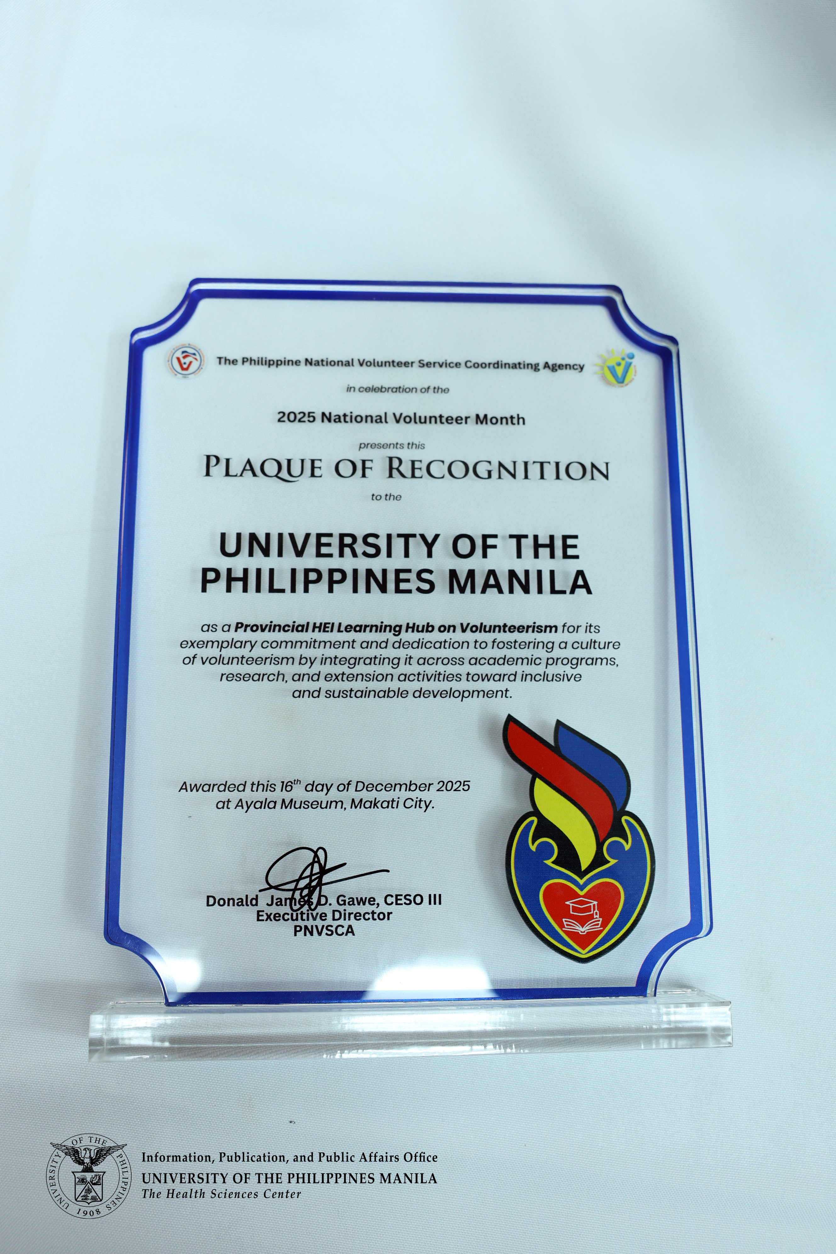 The plaque of recognition was awarded by the Philippine National Volunteer Service Coordinating Agency on Dec. 16, 2025, to the University of the Philippines Manila, naming it a Provincial HEI Learning Hub on Volunteerism.
