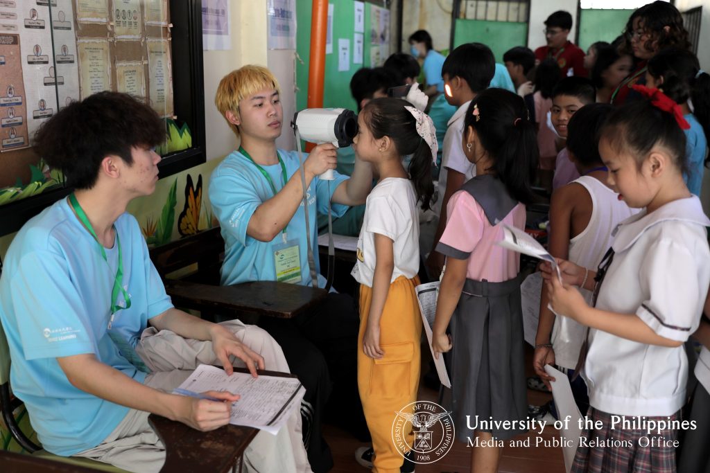 UP and HKPolyU students assess and assist elementary pupils for vision screening at Krus na Ligas Elementary School on Jan. 4. Photo by Jun Madrid, UP MPRO.